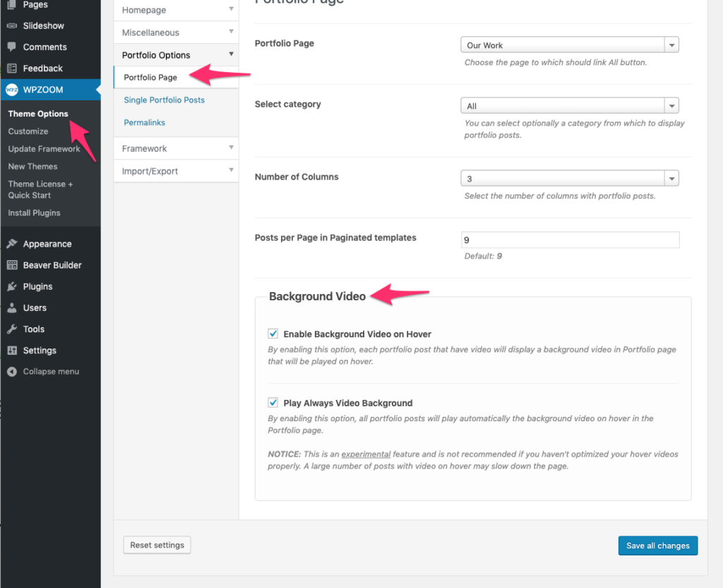 Before using this feature, make sure it’s enabled in Theme Options > Portfolio Options > Background Video: