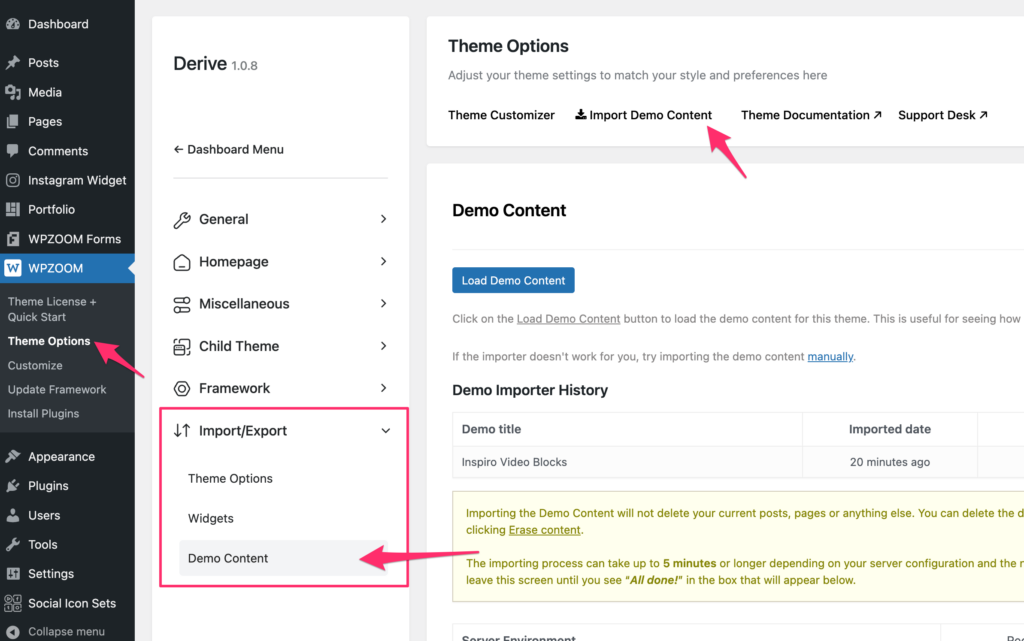 while in other themes, you will need to go to the WPZOOM > Demo Importer page to import the demo content: