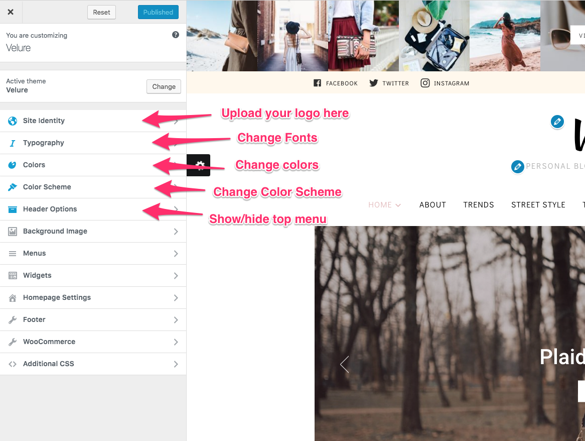 Below is just an example of a few available panels in Customizer of the Velure theme.