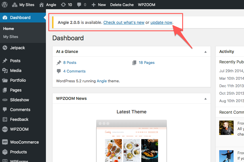 When a new version of your WPZOOM theme is available, you will see a yellow notice at the top of your WordPress Dashboard.