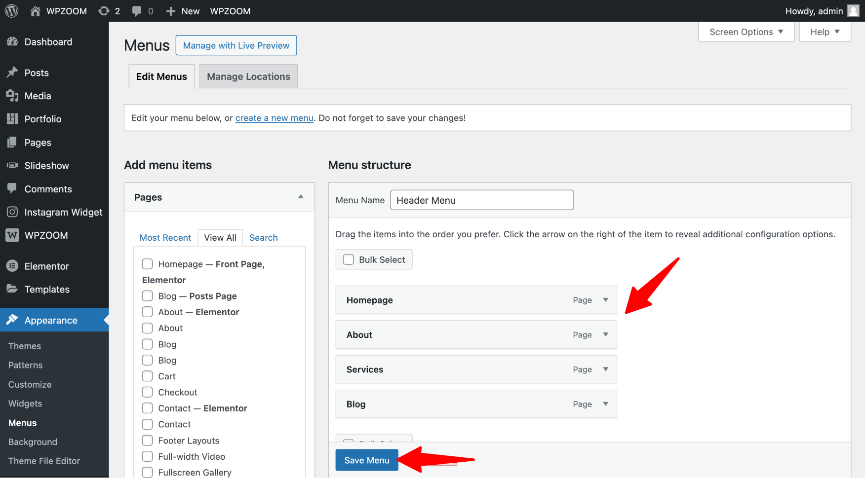 5. Drag and drop item from your menu to put them in the order you want or to create sub-menus. Don’t forget to save your modifications by clicking Save Menu.
