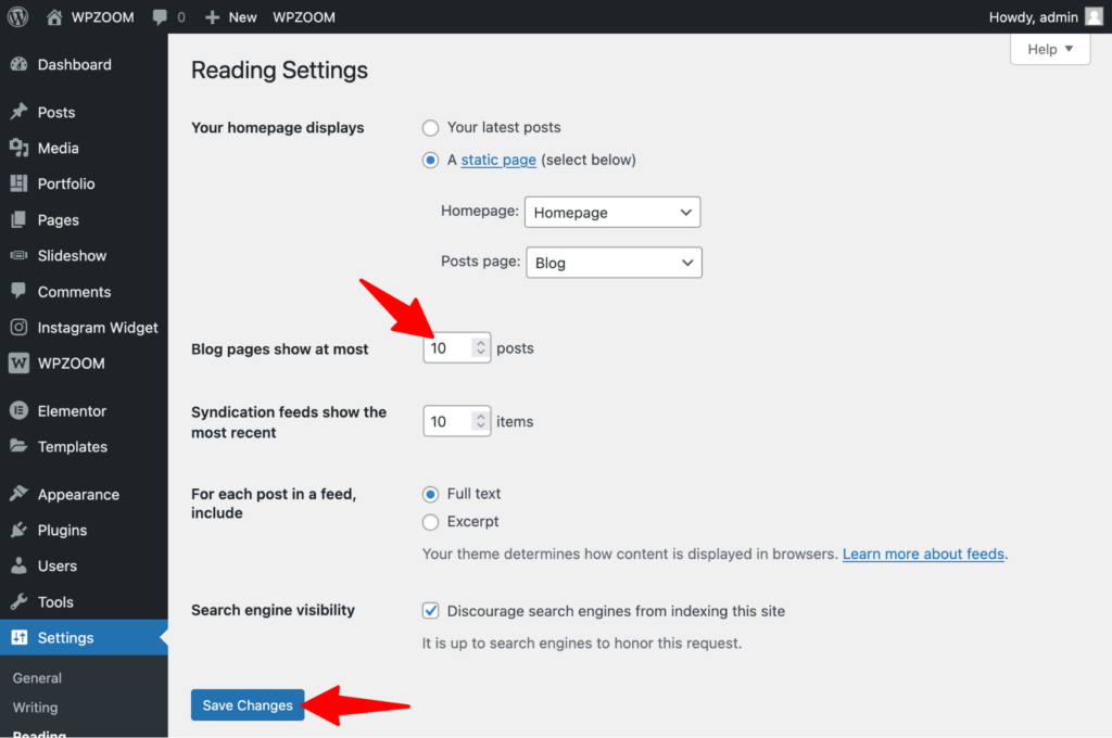 2. Edit the Blog pages show at most field by entering the number of posts to be displayed, per page, on your site. Click Save Changes.