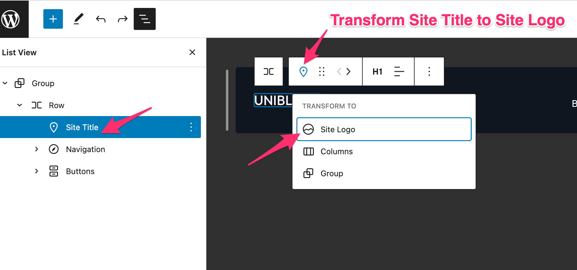 Now you have a few options: you can either transform the existing Site Title block into a Site Logo, or you can manually delete the Site Title and add the Site Logo block: