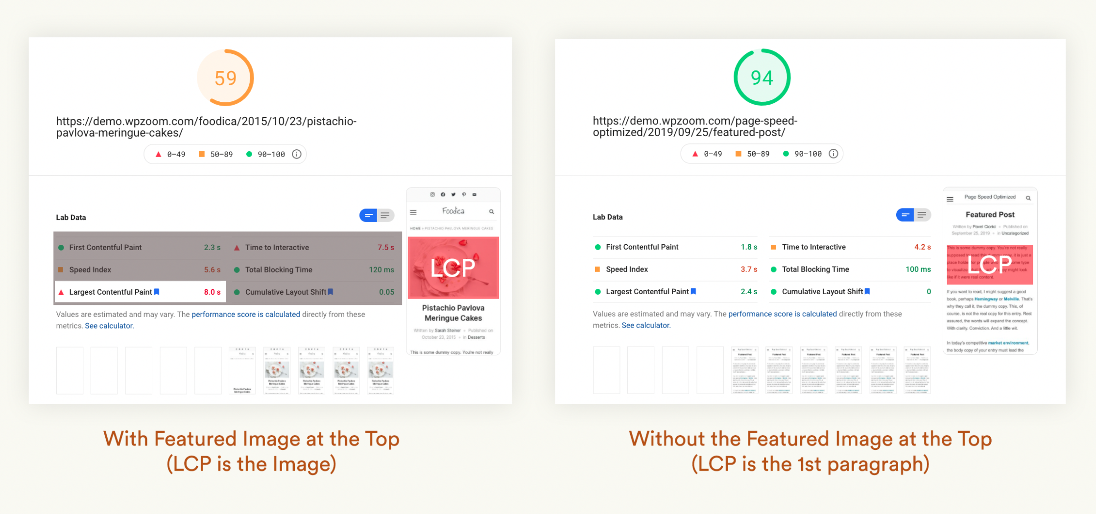 The score will be higher if the Largest Contentful Paint (LCP) will be text (the title or the first paragraph).