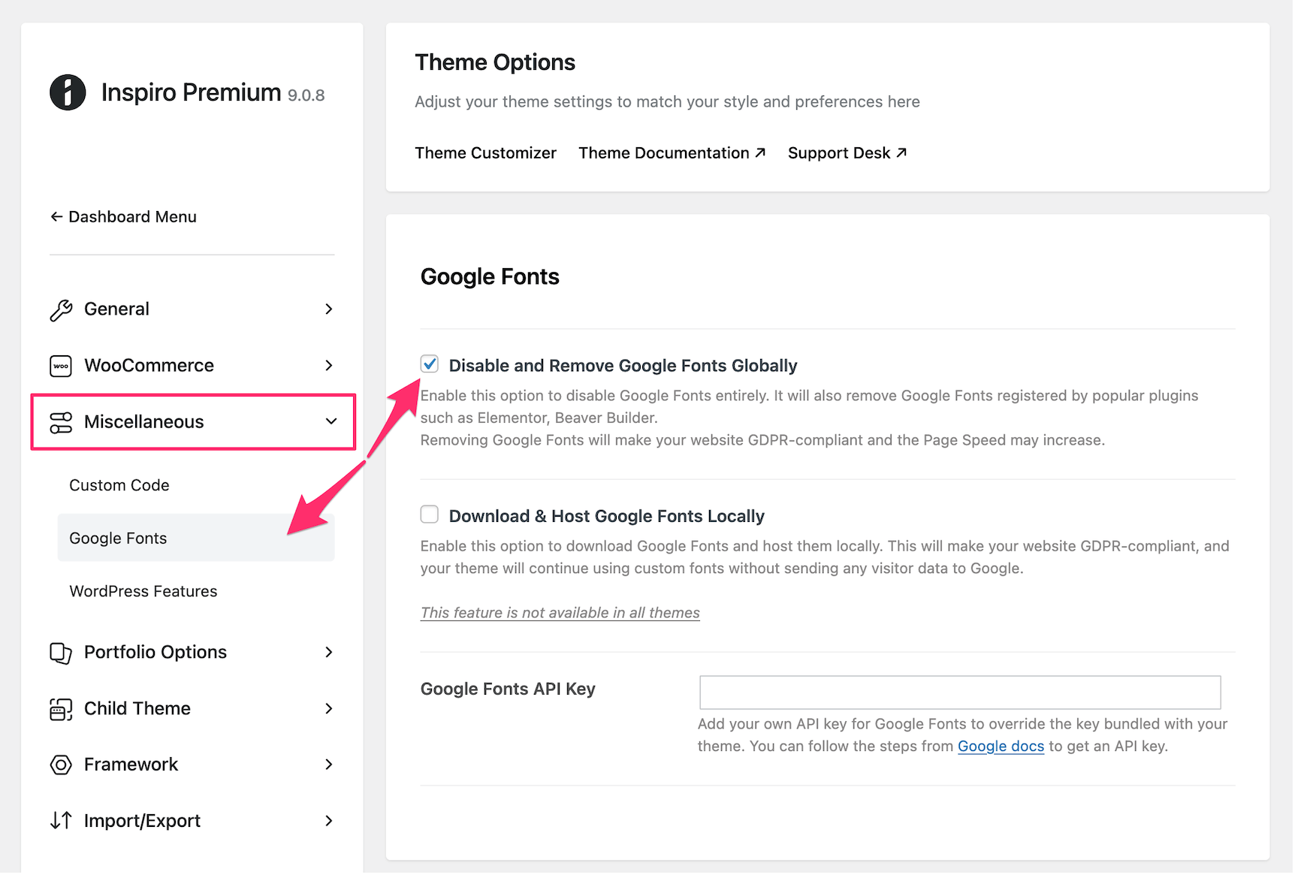 2. Navigate to the Miscellaneous > Google Fonts and tick the “Disable and Remove Google Fonts Globally” checkbox.