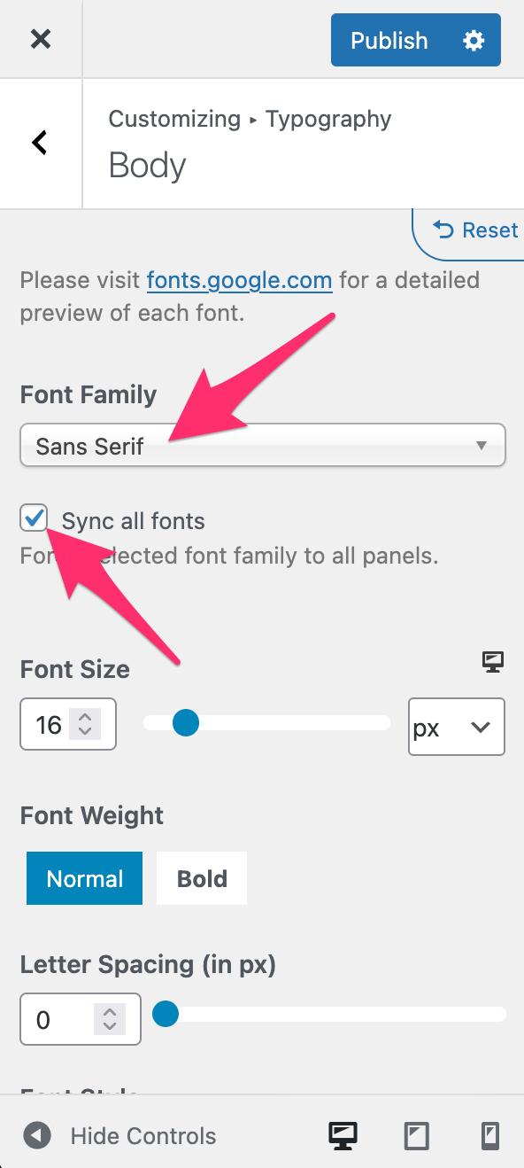 Make sure to also tick the “Sync all fonts” option for your Body font, so this will be applied to all other typography options available in your theme.