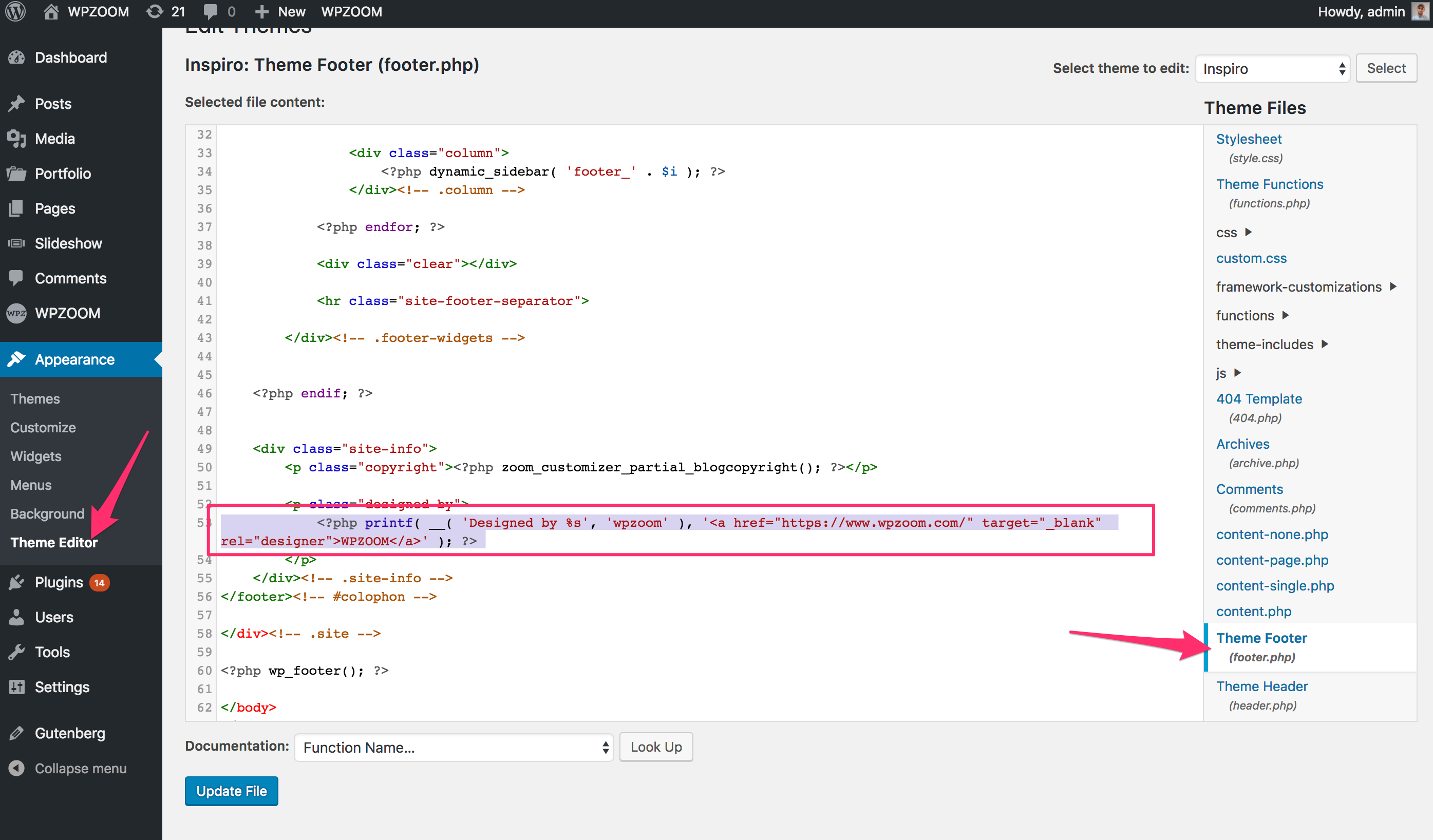 You can remove “Designed by WPZOOM” text from the footer by adding the following CSS Code in Appearance > Customizer > Additional CSS: