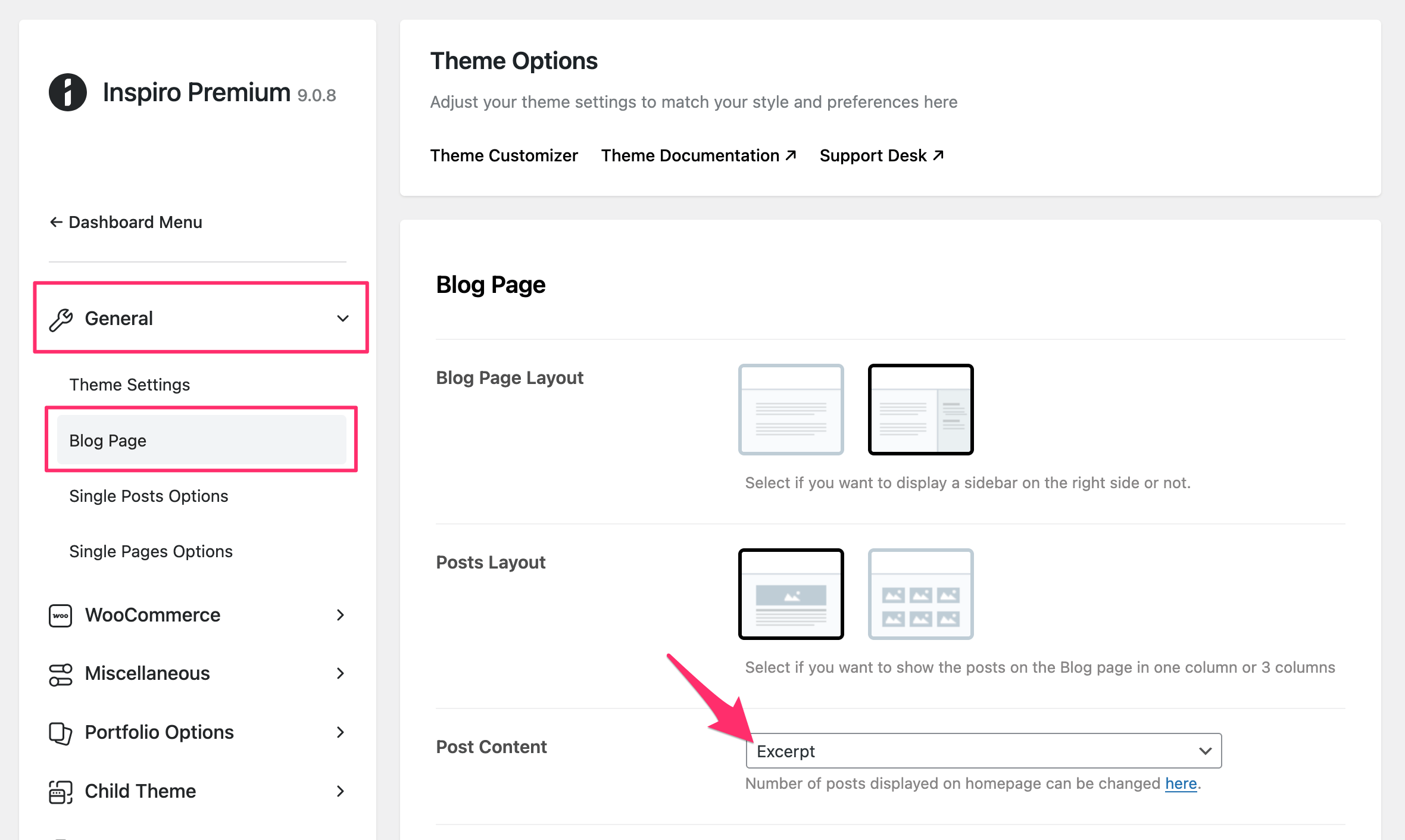 2. Navigate to General > Blog Page and choose your preferred option for Post Content.