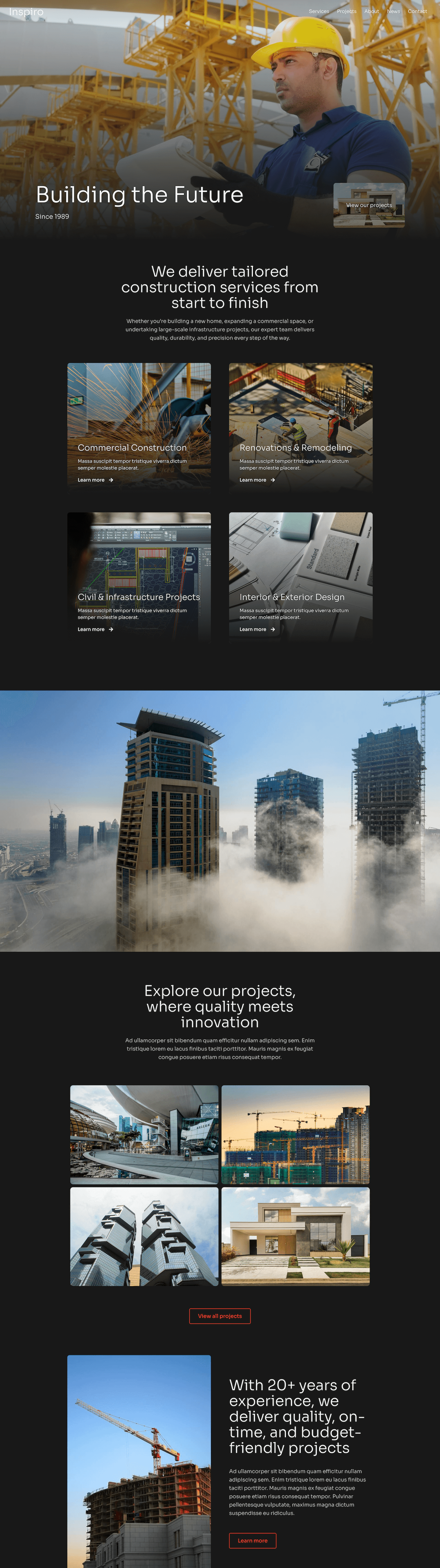 The Construction starter site for Inspiro Premium is a powerful construction WordPress theme tailored for builders, contractors, and architects. With a modern and professional layout, this construction website template helps you showcase projects, highlight services, and attract new clients. Dynamic galleries, service breakdowns, and call-to-action sections make it easy to present your expertise and engage visitors.