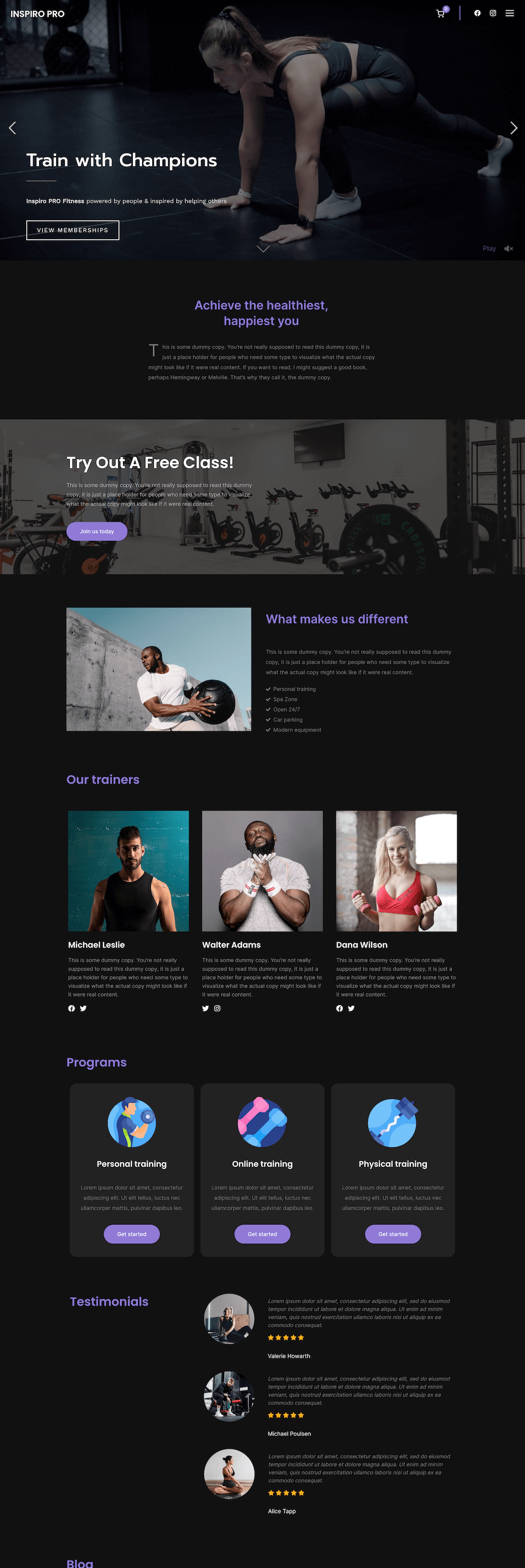 The Fitness / Gym starter site for Inspiro Premium is a dynamic and high-energy fitness WordPress theme designed for gyms, personal trainers, and sports clubs. Whether you need a fitness website template to promote memberships, showcase trainers, or offer class schedules, this layout provides a bold and engaging structure tailored to the health and wellness industry.