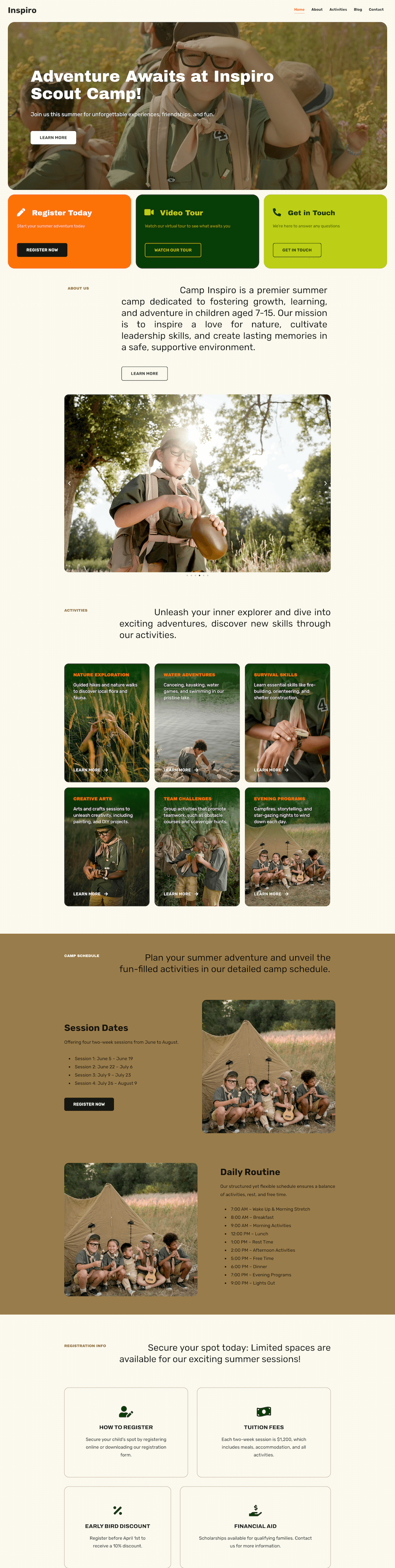The Kids/Summer Camp starter site for Inspiro Premium is a vibrant and engaging camp WordPress theme designed for youth camps, outdoor adventure programs, and scouting groups. If you’re looking for a summer camp website template to highlight activities, schedules, and enrollment details, this layout provides a fun and structured design tailored for camps of all sizes.