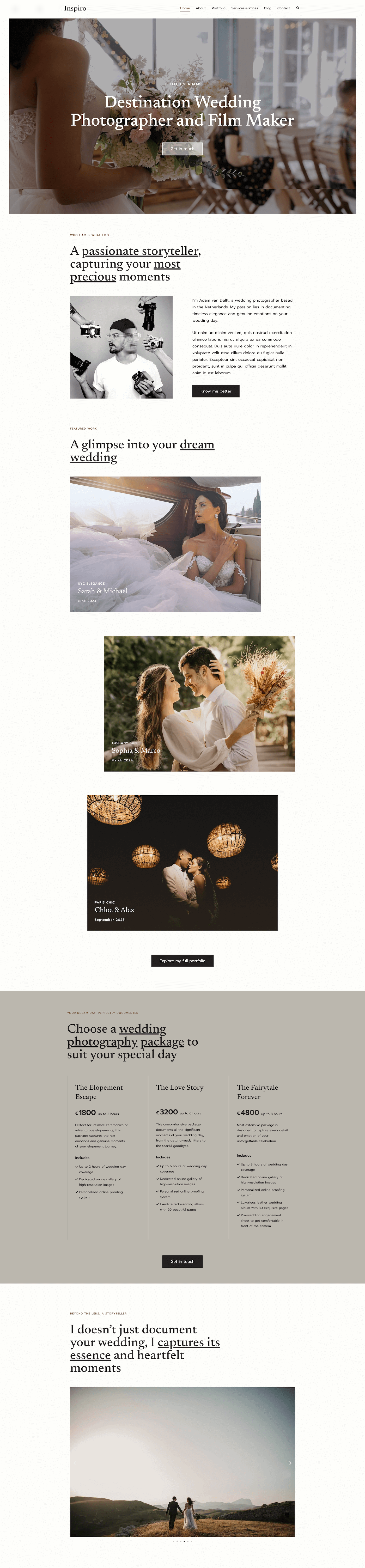 The Wedding Photographer starter site for Inspiro Premium is a beautifully designed WordPress theme tailored for wedding photographers, videographers, and visual storytellers. Whether you’re capturing intimate ceremonies, grand celebrations, or destination weddings, this elegant photography website template provides the perfect showcase for your portfolio and services.