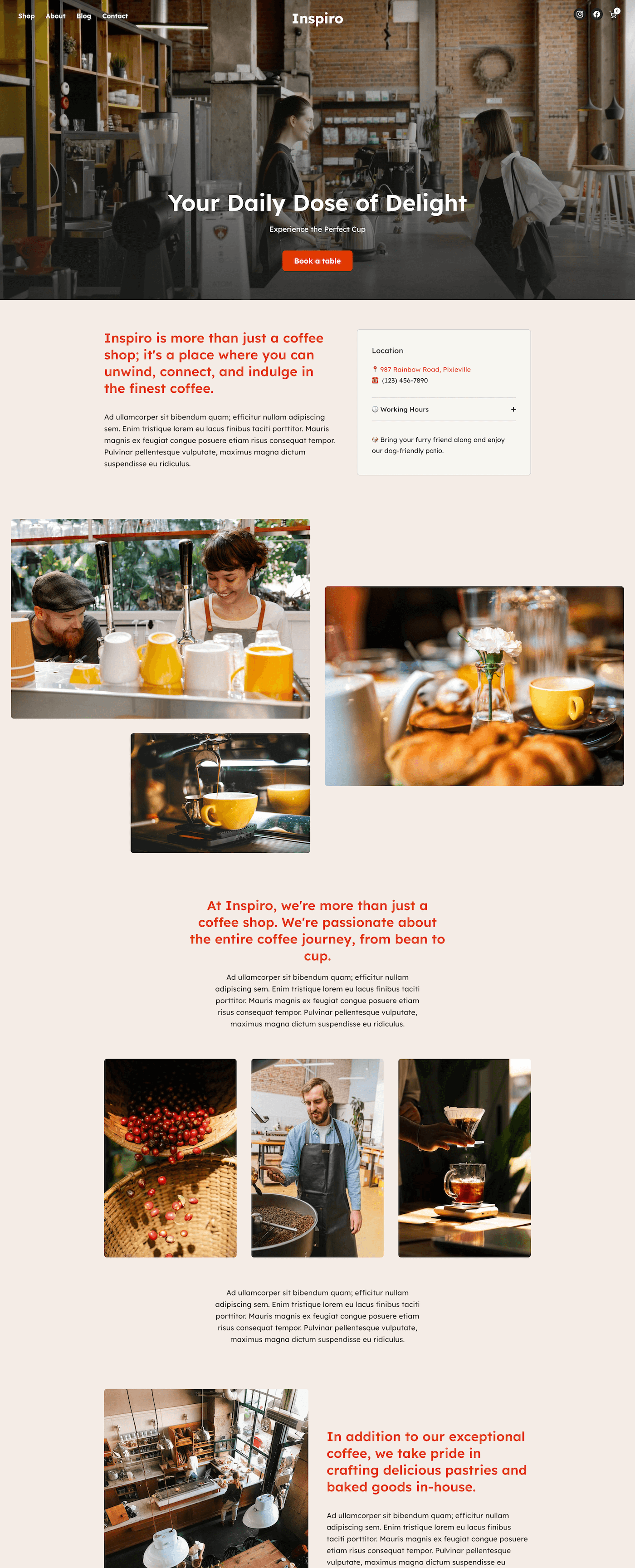 Coffee Shop WordPress theme, About page, Shop page, Blog page, Contact page