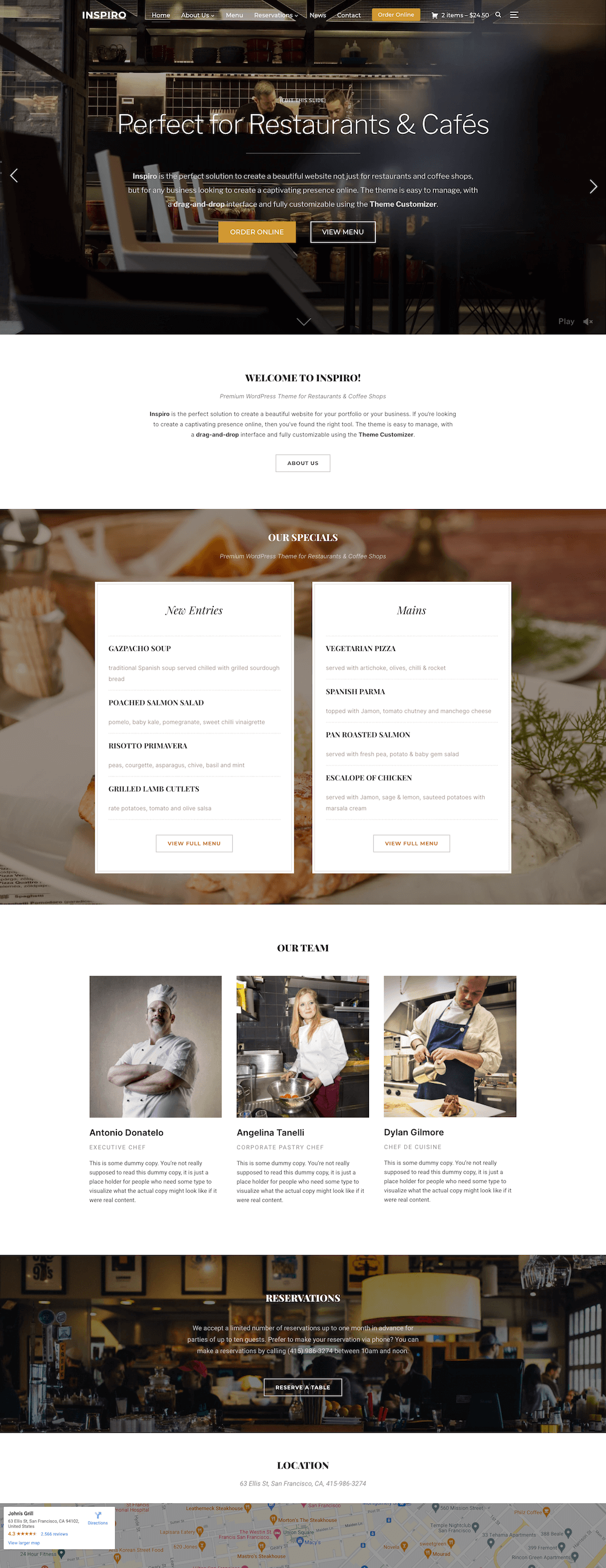 The Restaurant / Café starter site for Inspiro Premium is a stylish and modern restaurant WordPress theme designed for cafés, bistros, and fine dining establishments. Whether you need a restaurant website template to showcase your menu, accept reservations, or highlight customer reviews, this layout provides an elegant and functional structure tailored to the food and hospitality industry.