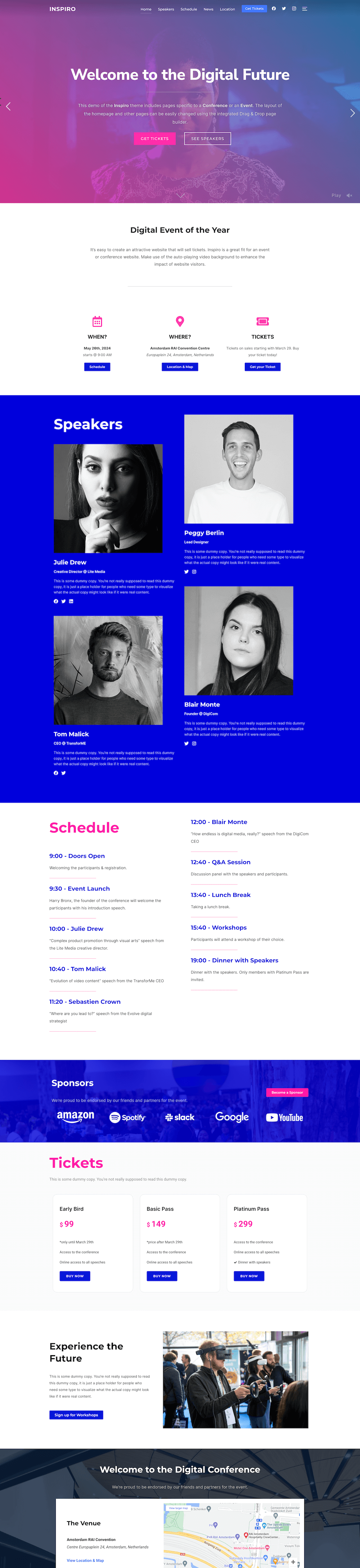 Events WordPress theme, Speakers page, Schedule page, Tickets page, Contact page