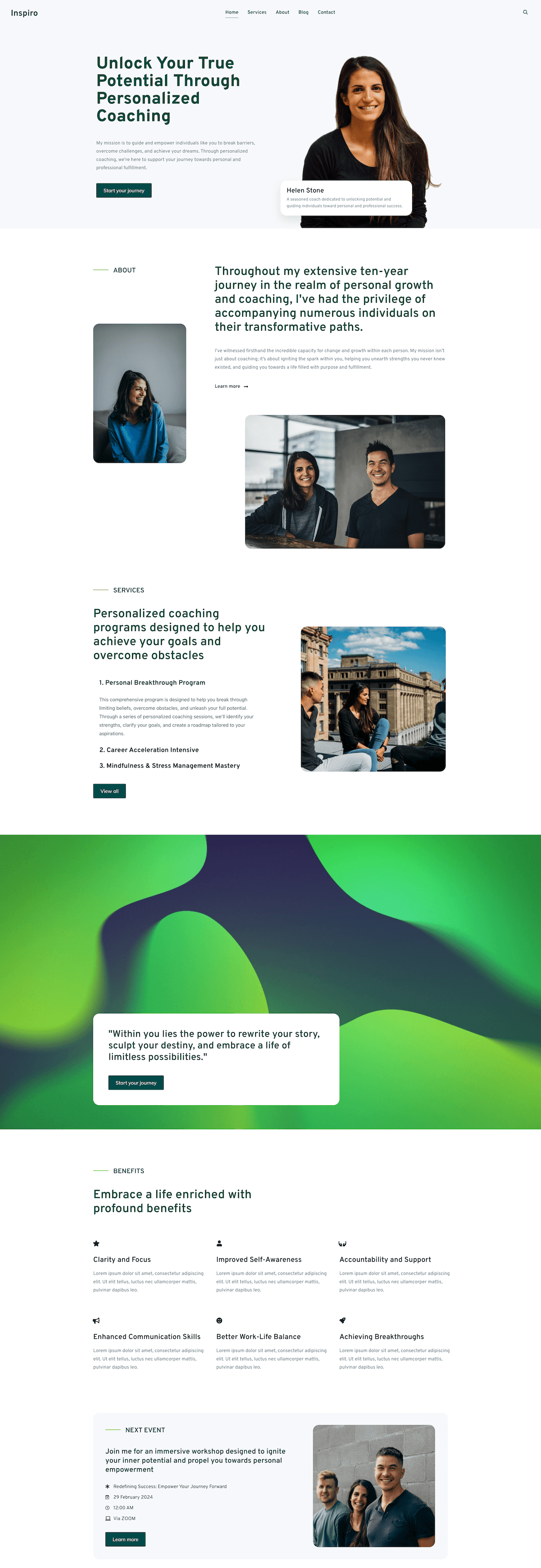 The Author & Coach starter site for Inspiro Premium is a clean, modern author WordPress theme designed for coaches, speakers, and writers looking to showcase their expertise. Whether you need an author website template to promote books, courses, or coaching services, this layout provides an elegant structure that keeps your message clear and engaging.