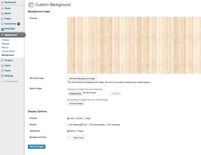 Another way of changing the background in your theme is doing it via Theme Customizer, that can be accessed from Appearance → Themes → Customize:
