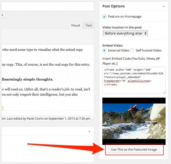 All you have to do is to click on the Use This as the Featured Image button that appears below the video thumbnail.