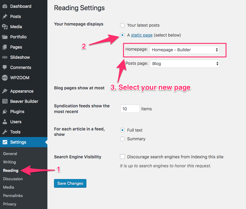 Once you’ve published or edited the page you want to use as your front page, go to Settings > Reading page and select your page in the option: “A static page > Homepage“: