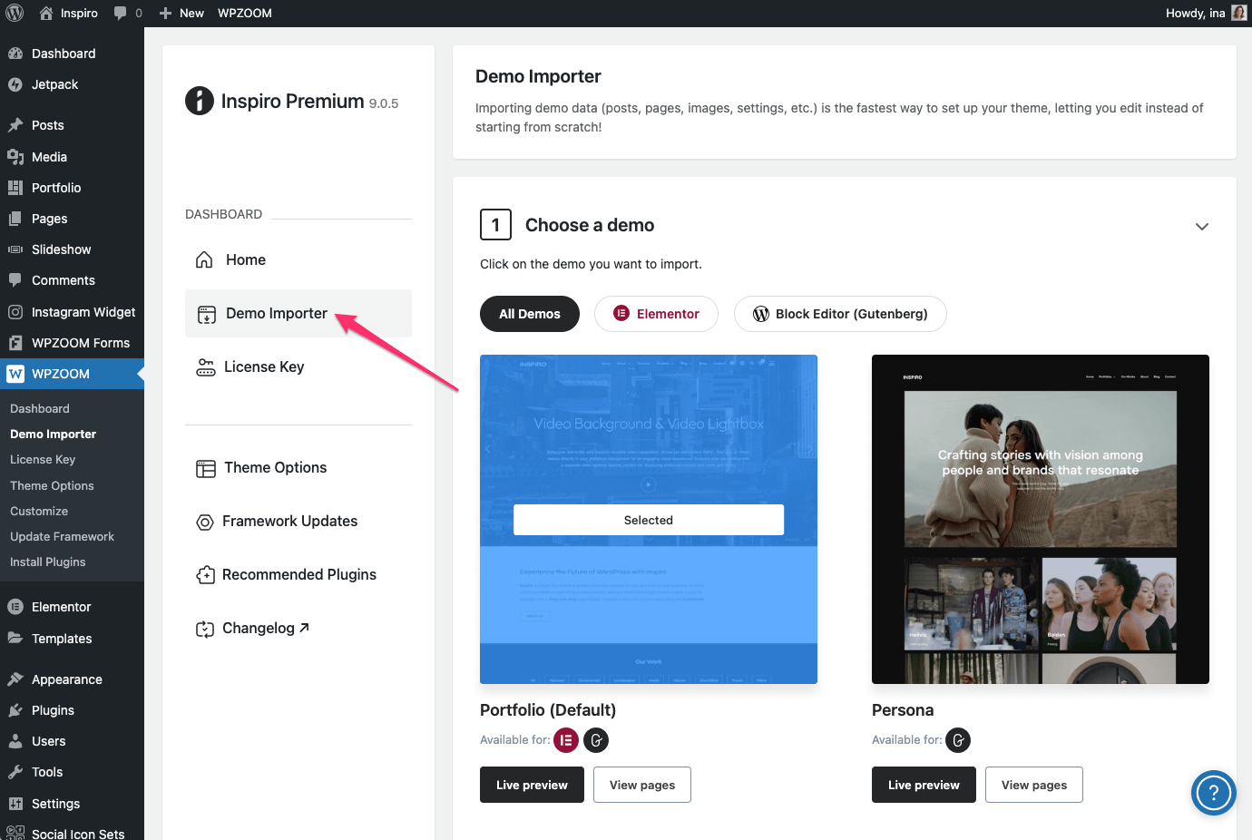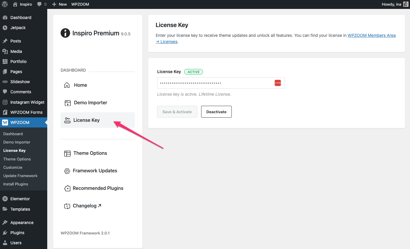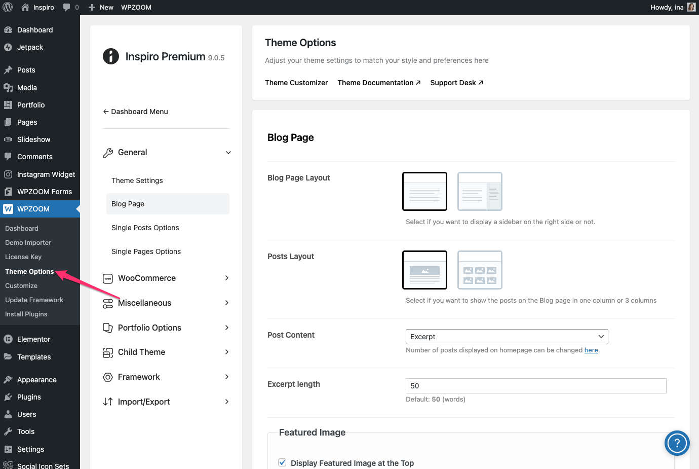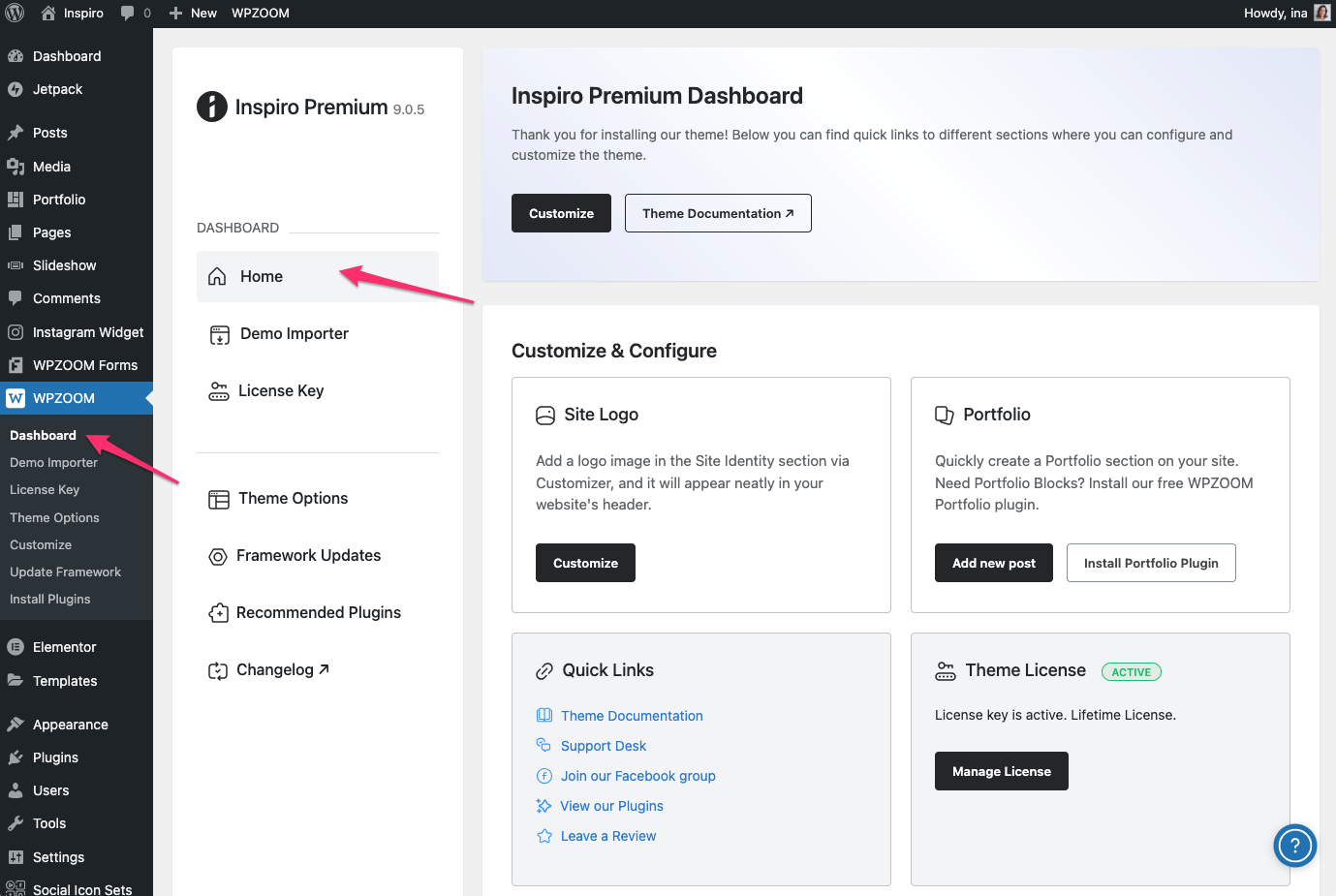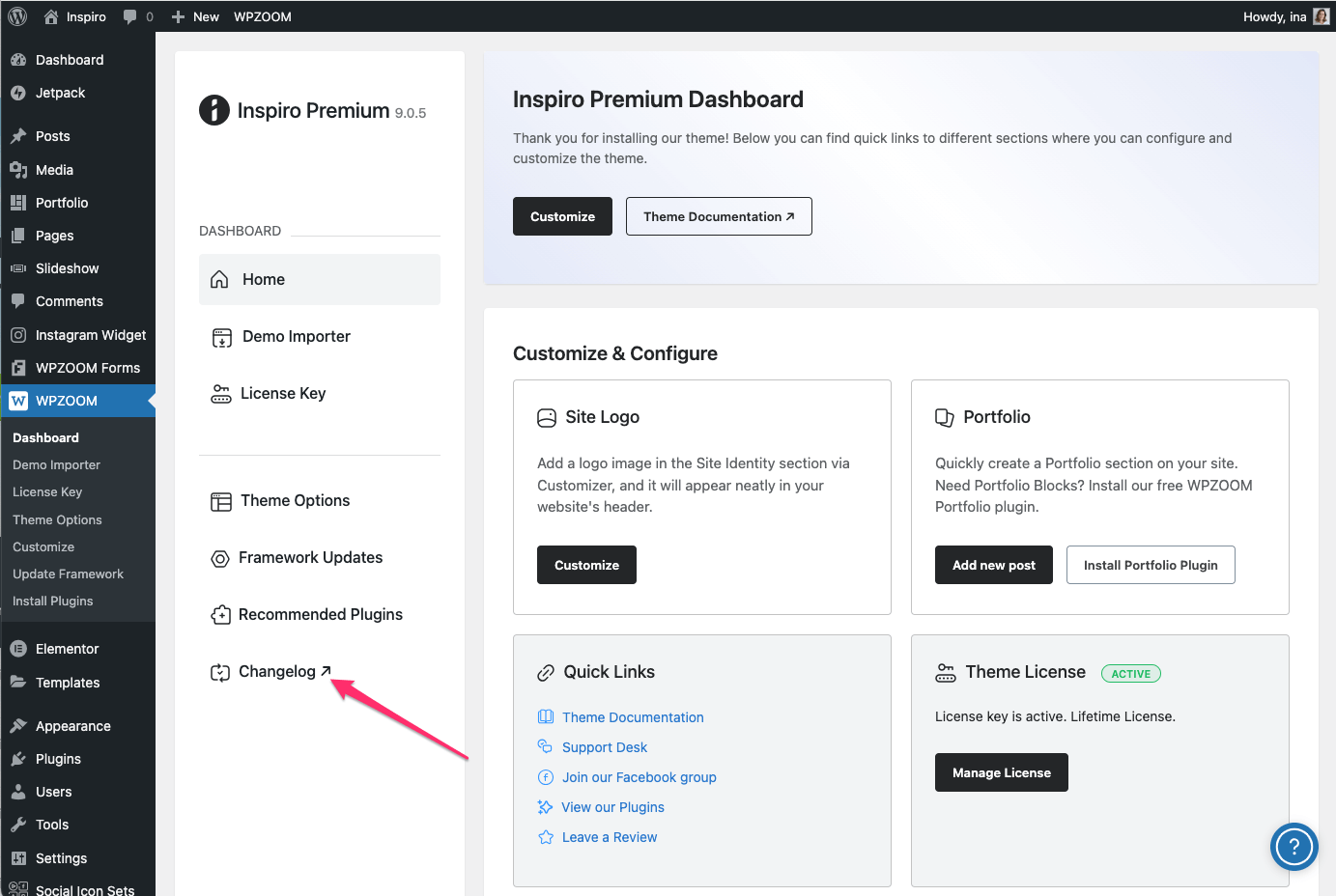 Once you install and activate Inspiro Premium, a new menu item called WPZOOM will appear in your WordPress Dashboard. This is the Inspiro Premium Dashboard, a centralized panel that gives you quick access to theme settings, tools, and updates.