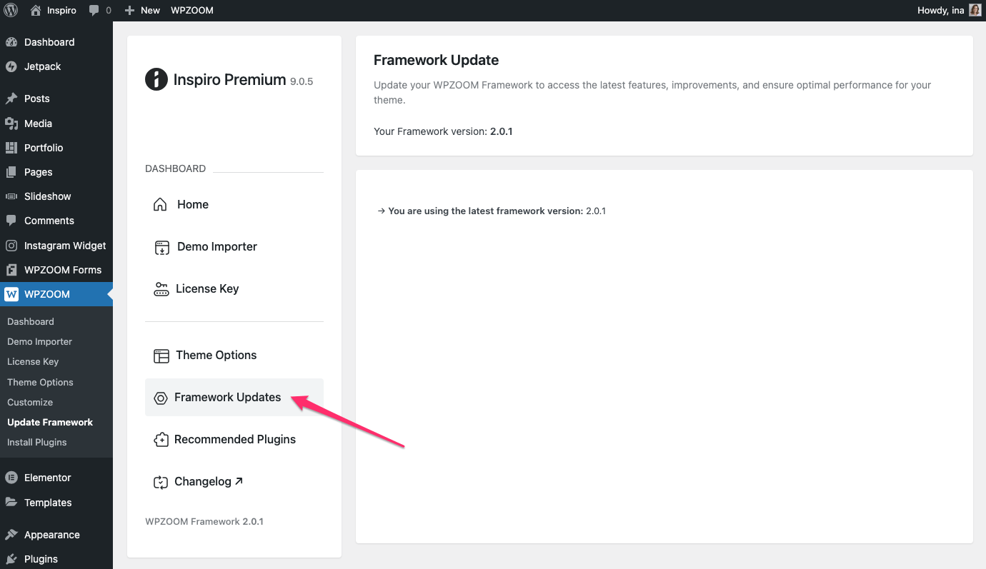 The Framework Updates panel is where you can manually update the ZOOM Framework, which powers the back-end structure of Inspiro Premium.