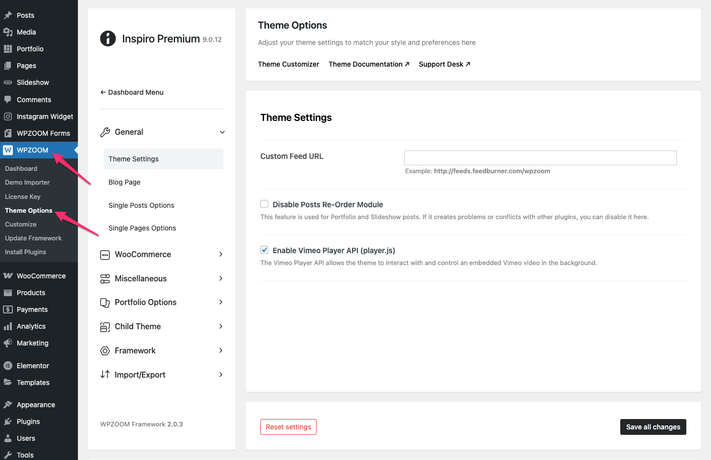 Inspiro Premium includes a dedicated Theme Options panel, accessible from WPZOOM → Theme Options in your WordPress Dashboard. Powered by the ZOOM Framework, this panel allows you to manage advanced theme settings that go beyond the Customizer, covering layout, functionality, portfolio behavior, WooCommerce integration, and more.