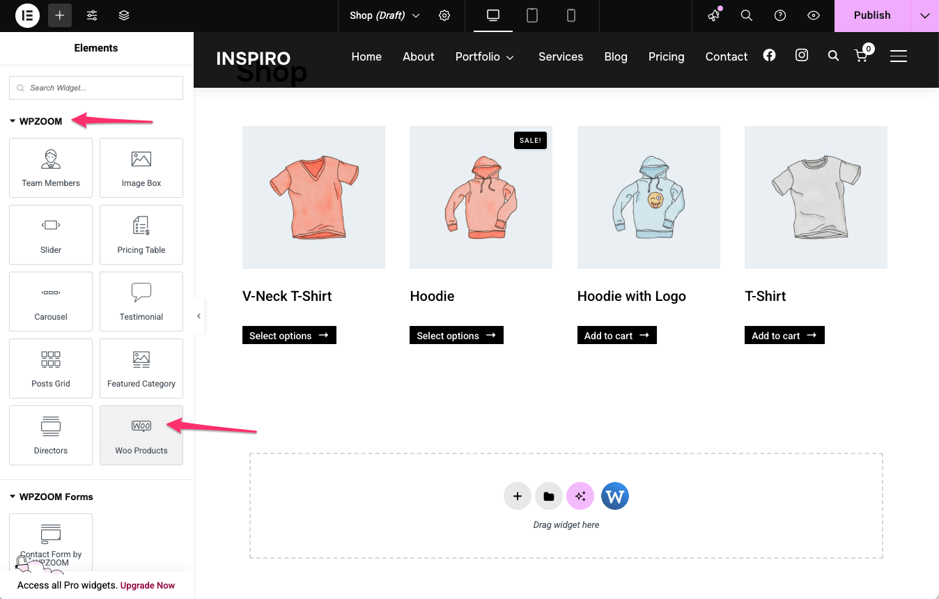 If you install and activate the WPZOOM Addons for Elementor plugin, you will have access to the Woo Products widget.