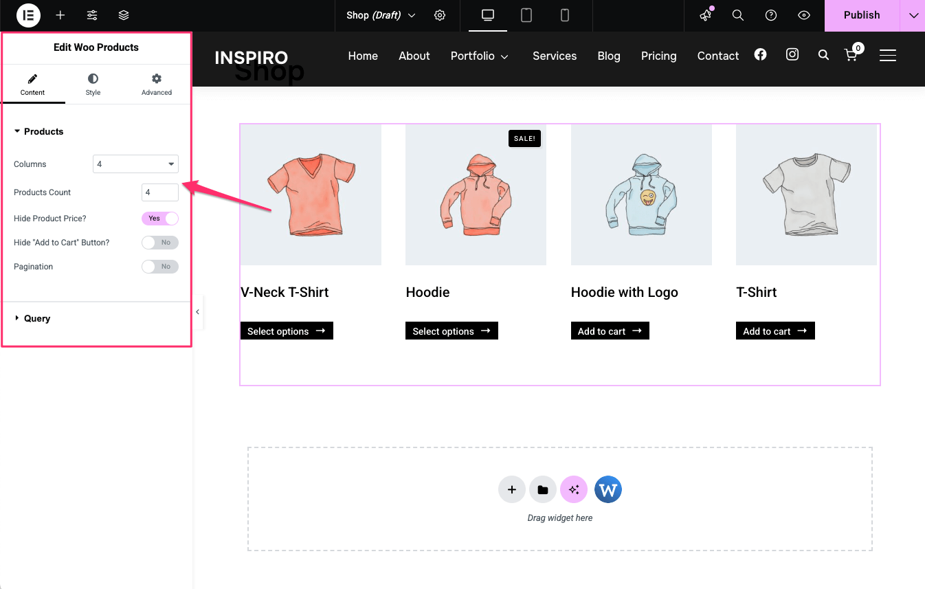 Use the widget on any Elementor page to display products.