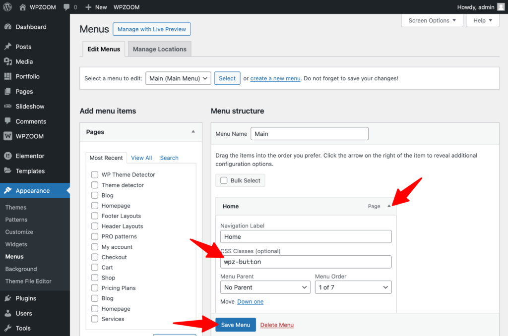 Add the wpz-button class into the “CSS Classes” field and click “Save Menu“.