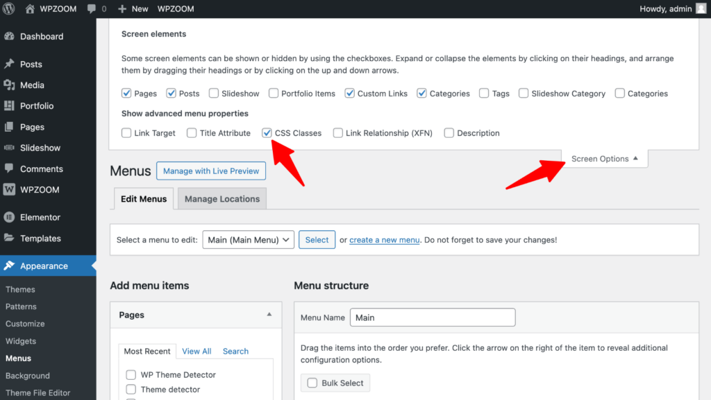 2. Click on Screen Options and make sure the CSS Classes checkbox is ticked.