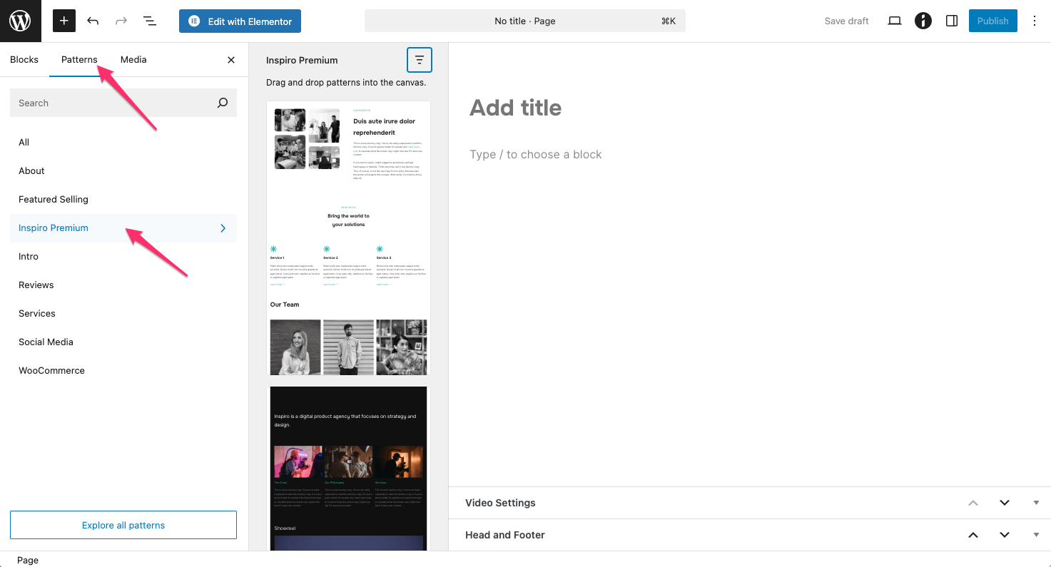 Go to Block Inserter → Patterns → Inspiro Premium to find pre-built layouts (e.g. About, Services, Hero sections).