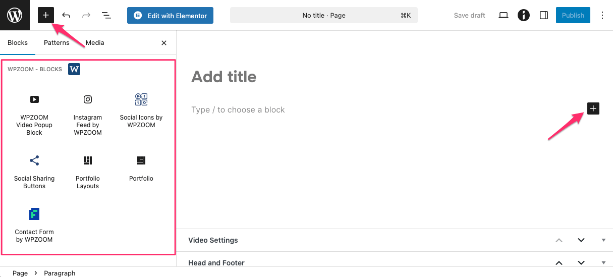 If you install a WPZOOM plugin (like the Social Icons or Portfolio plugin), new blocks will appear under the WPZOOM category in the block inserter. You can insert: