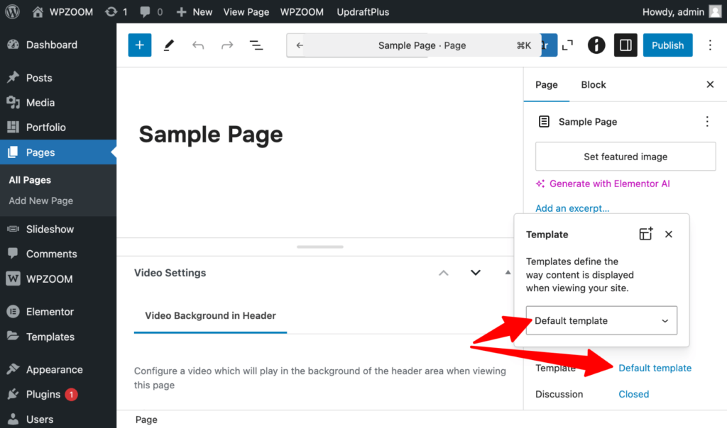When editing the page, in the right column, click “Default template, then one more time “Default template” in the drop-down menu that will appear:
