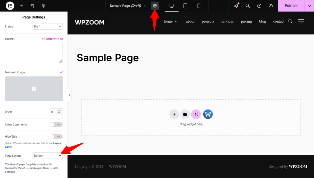 When using the Elementor editor, click the “Page Settings” icon from the top bar, then look for the “Page Layout” option:
