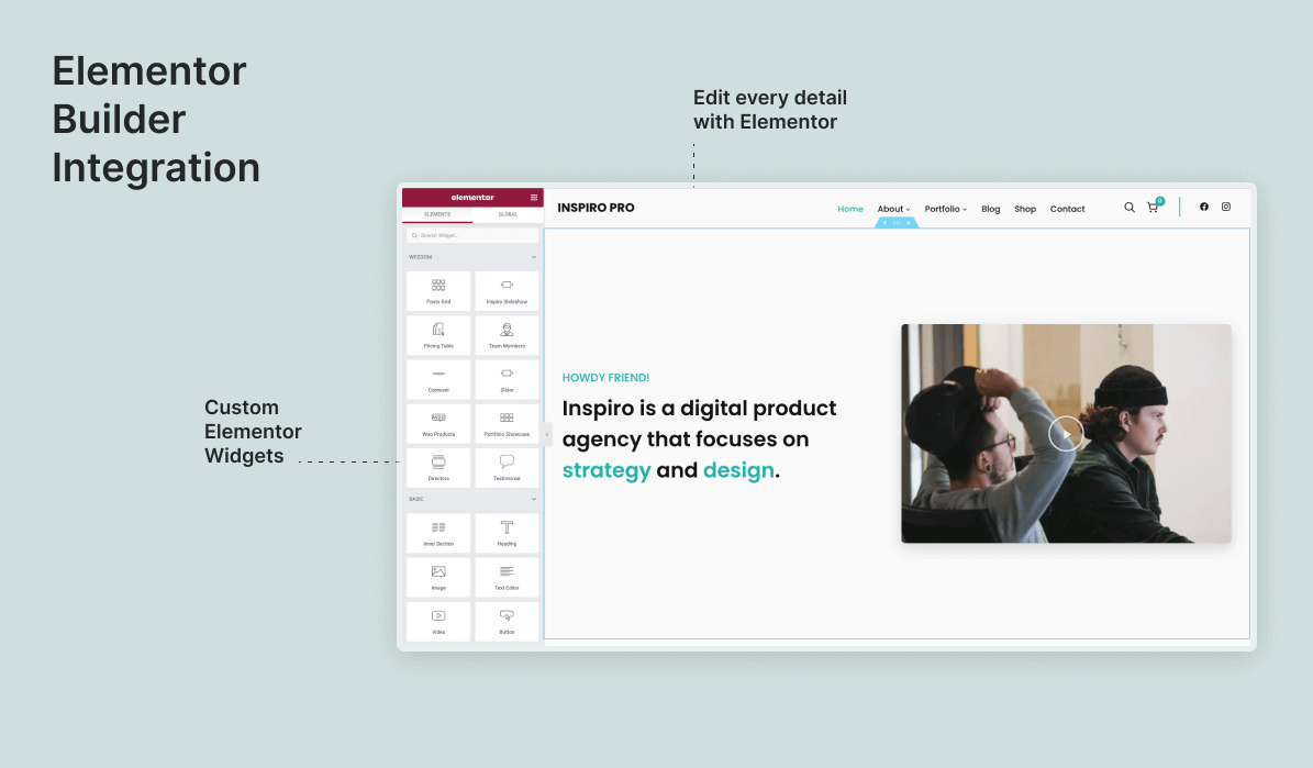 Everything you see in the demo of the Inspiro theme is achievable using the free version of Elementor and our free plugin Elementor Addons by WPZOOM, which we’ve developed specifically for Inspiro.