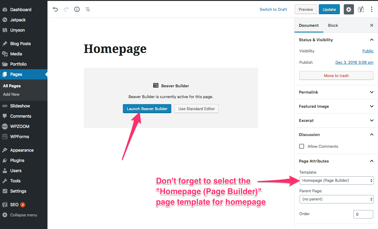 In order to get the best results, make sure to set the correct Page Templates to pages you create using the Beaver Builder: