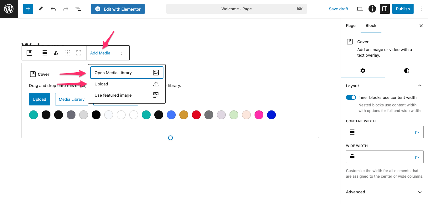 3. In the Cover block options, click Add Media and choose Open Media Library or Upload.