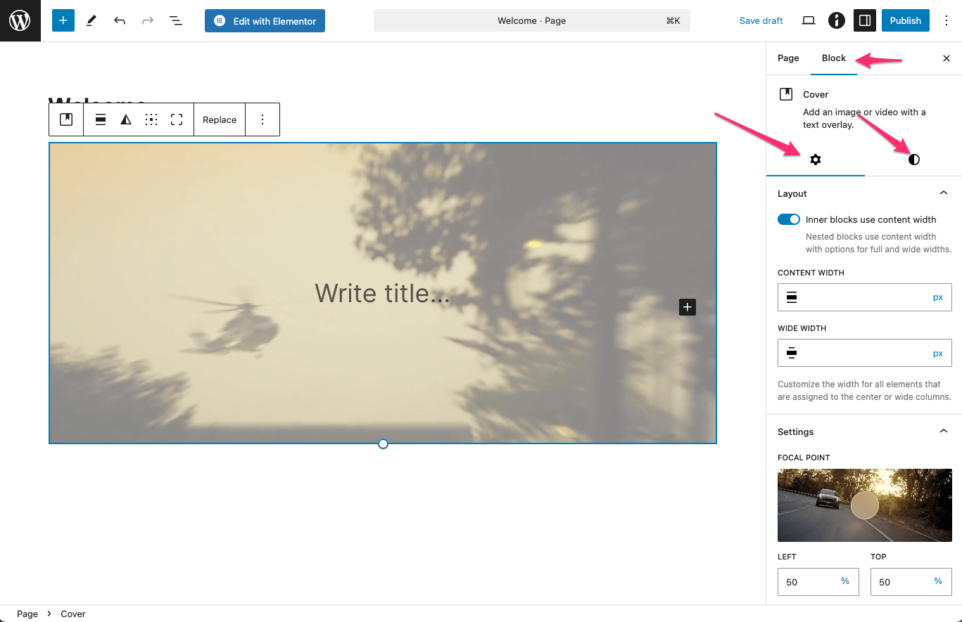 5. Adjust the cover block in the right sidebar of the editor in the Settings and Style tabs.