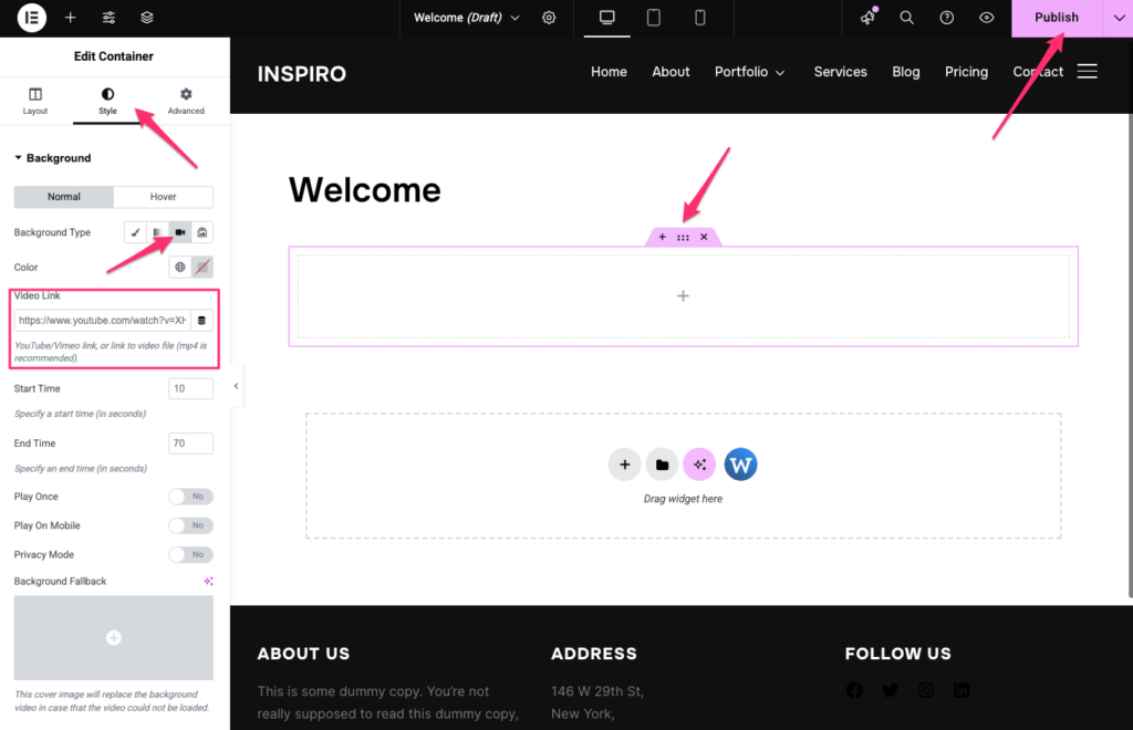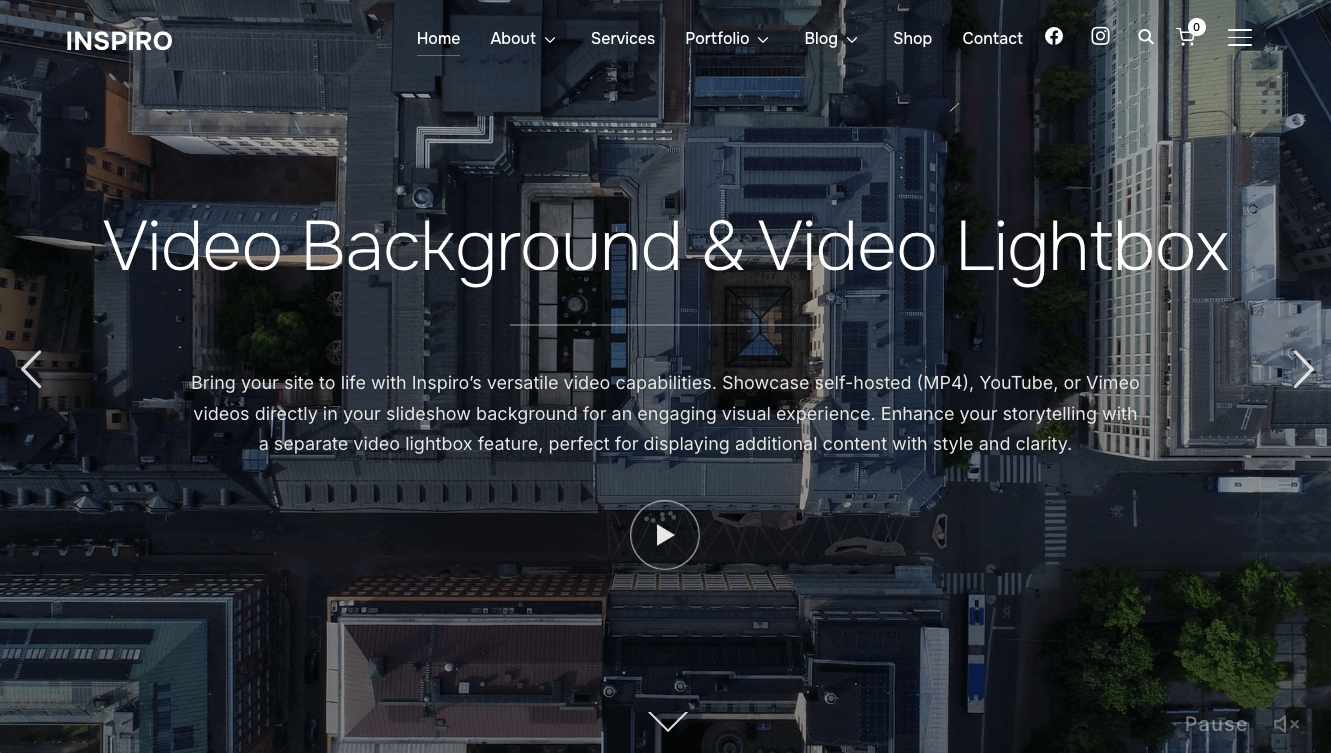 The Video Background feature is a key highlight of Inspiro, allowing you to create immersive, dynamic backgrounds using self-hosted or external video sources. You can add a video background in the following areas: