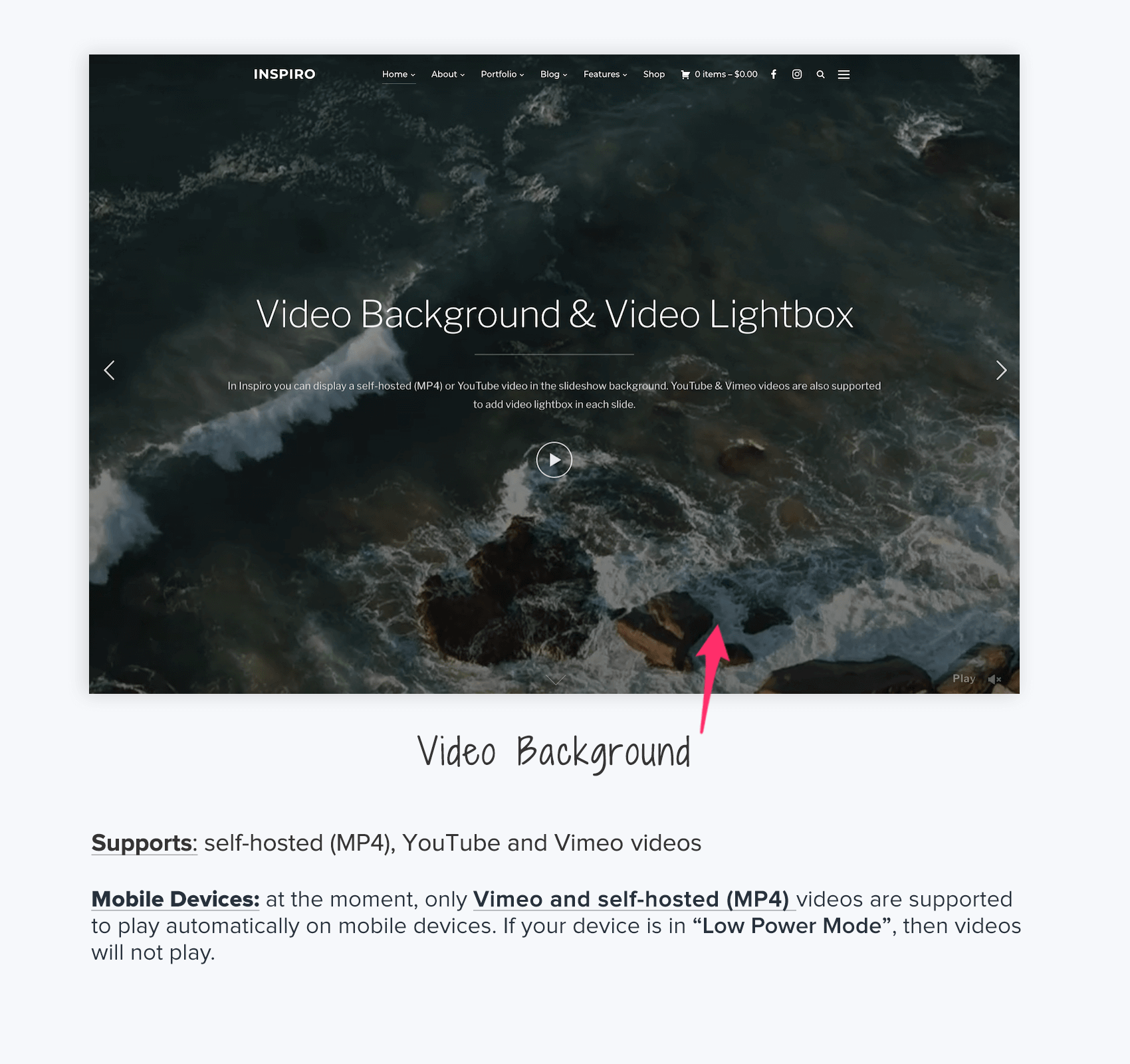 Inspiro supports video backgrounds on mobile devices. The best options for video background mobile support are self-hosted videos and Vimeo videos.
