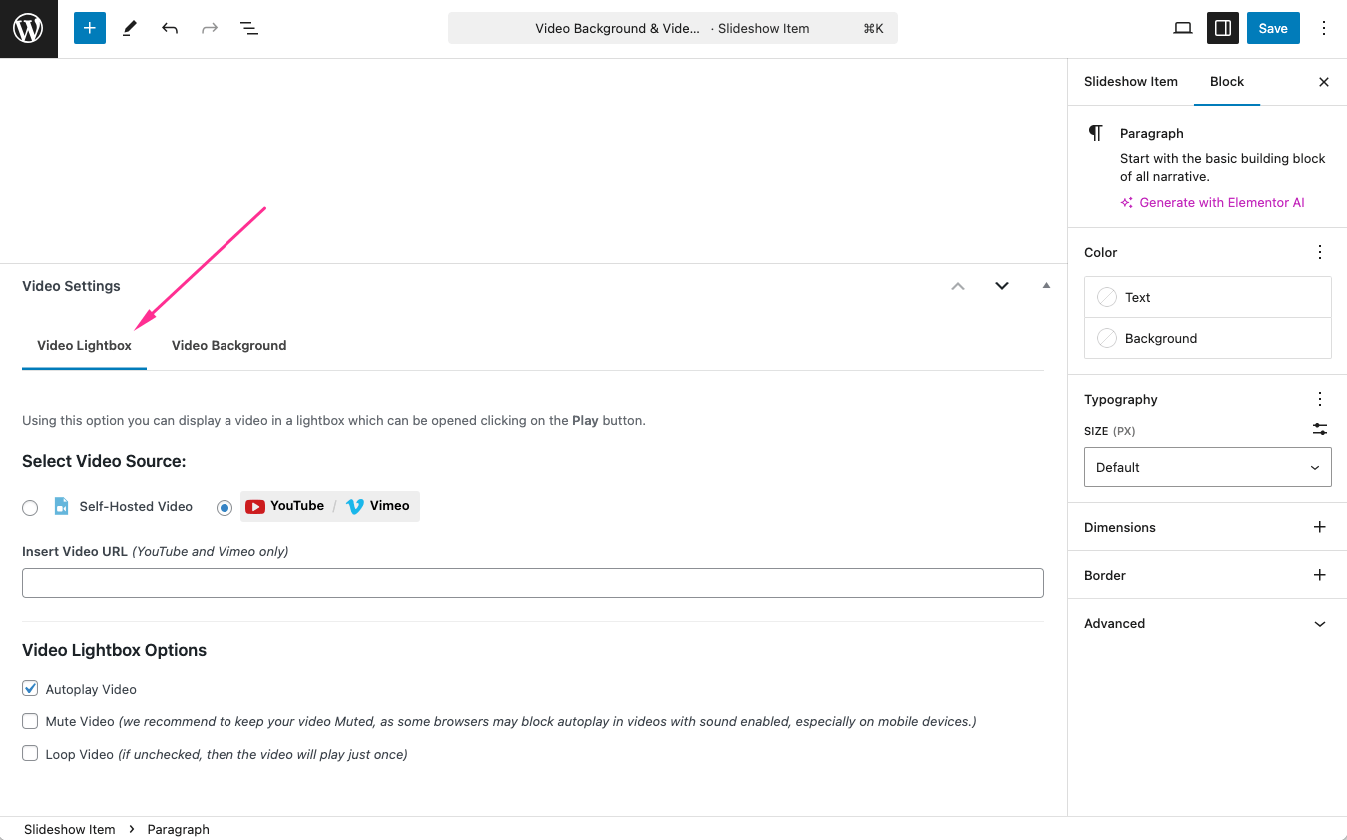 2. Scroll to the Video Settings section and click on the Video Lightbox tab