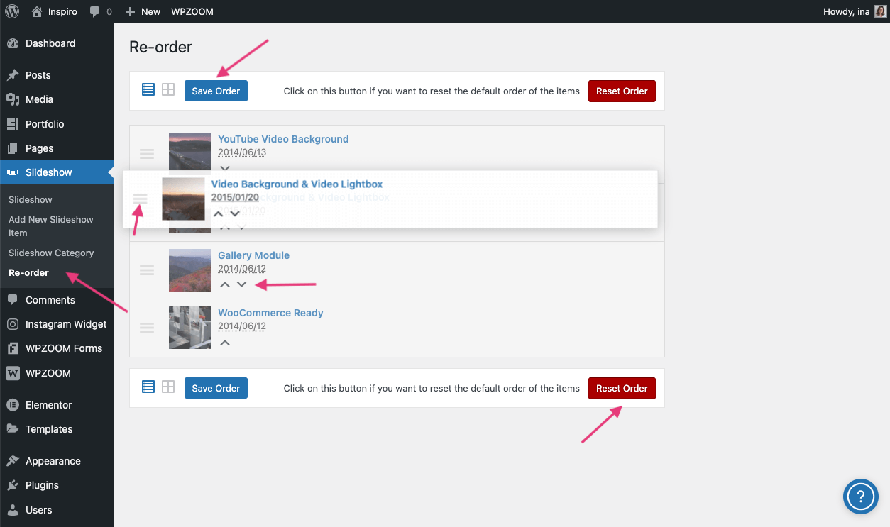 2. Drag and drop the slides into your preferred order or click on the up/down arrows under each item
