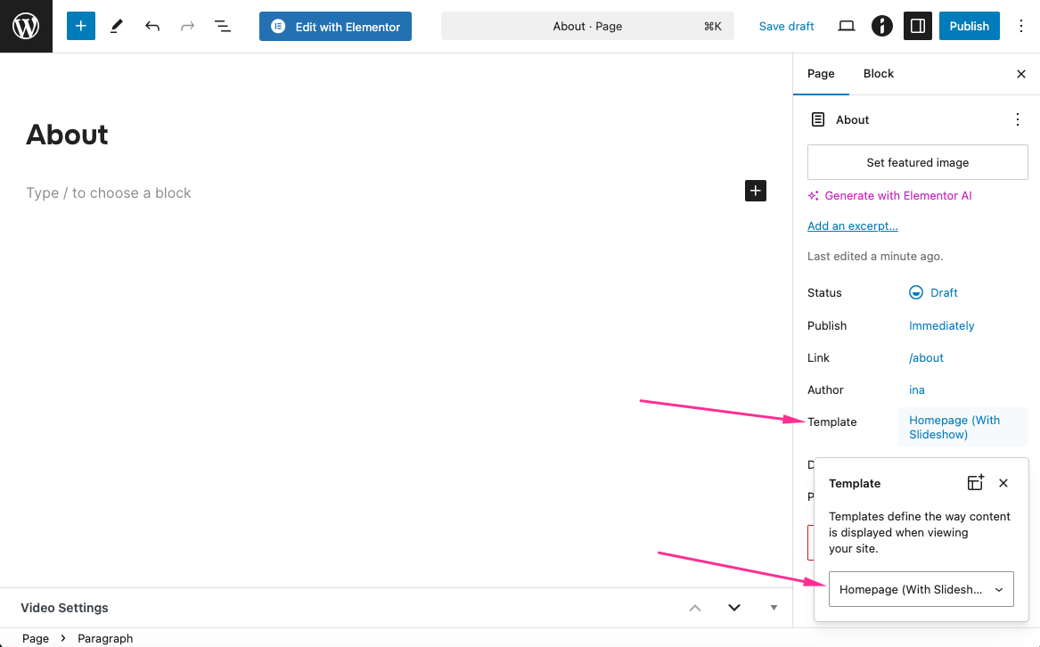 2. Select Homepage (With Slideshow) from the dropdown in the right sidebar under Template.