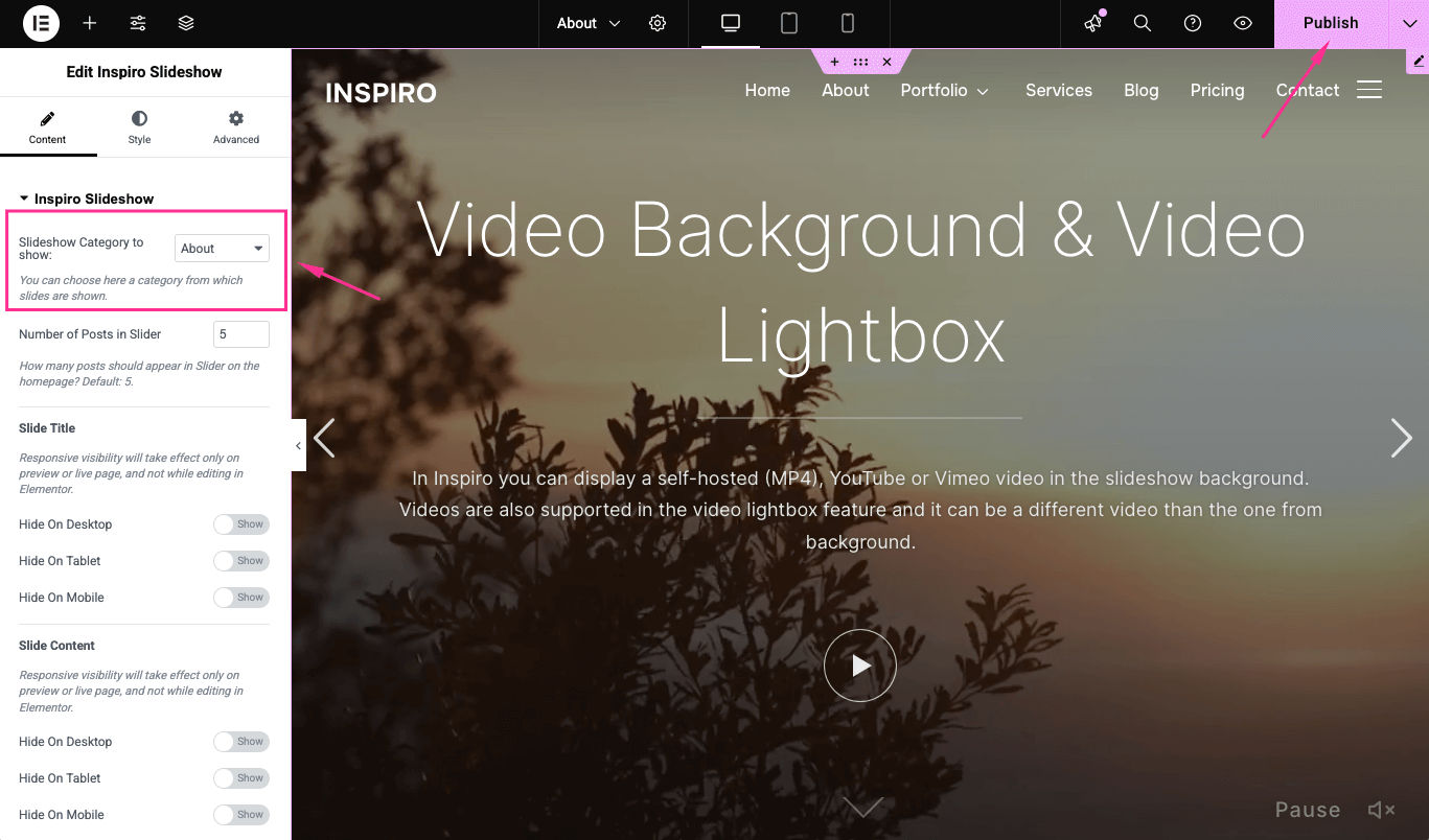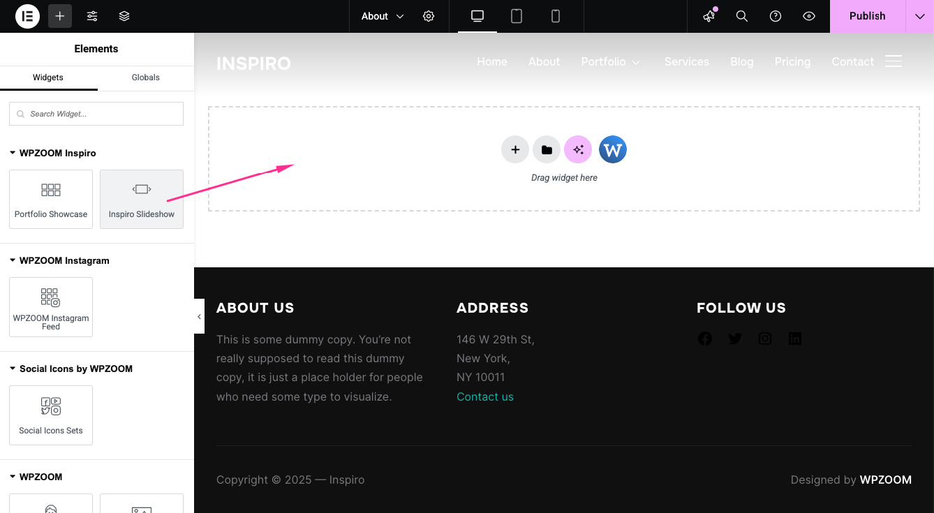 By default, the homepage slideshow in Inspiro displays all slideshow posts. However, you can also create and display separate slideshows on different pages—perfect for showcasing different categories of content or projects.
