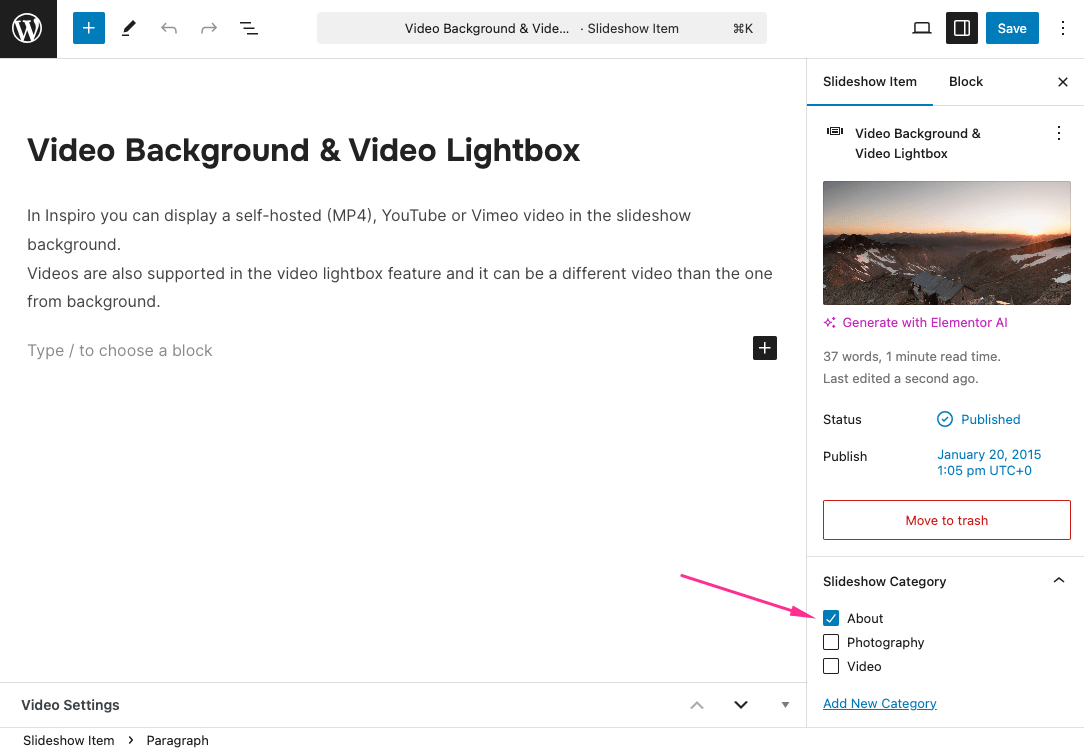 💡 You can also edit your homepage and assign a specific slideshow category to it if you want to exclude slideshow posts used on other pages.