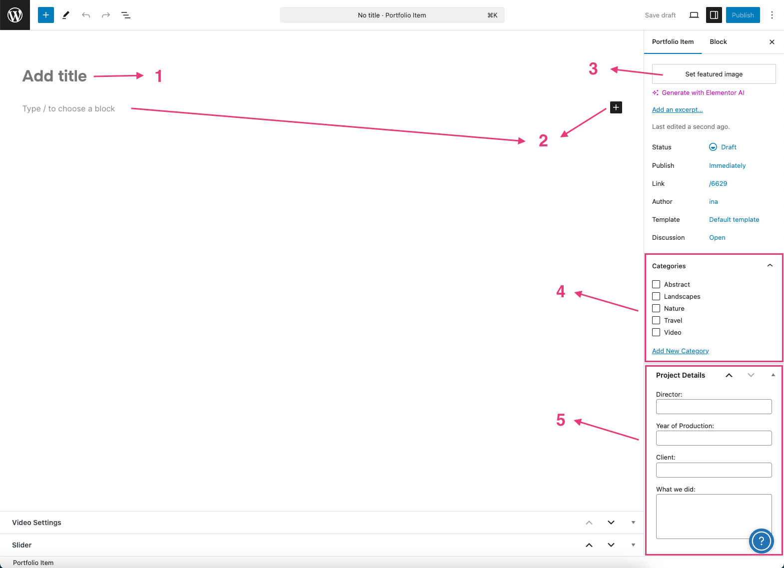 To create a new portfolio post, go to Portfolio → Add New in your WordPress dashboard. After this, configure the following options: