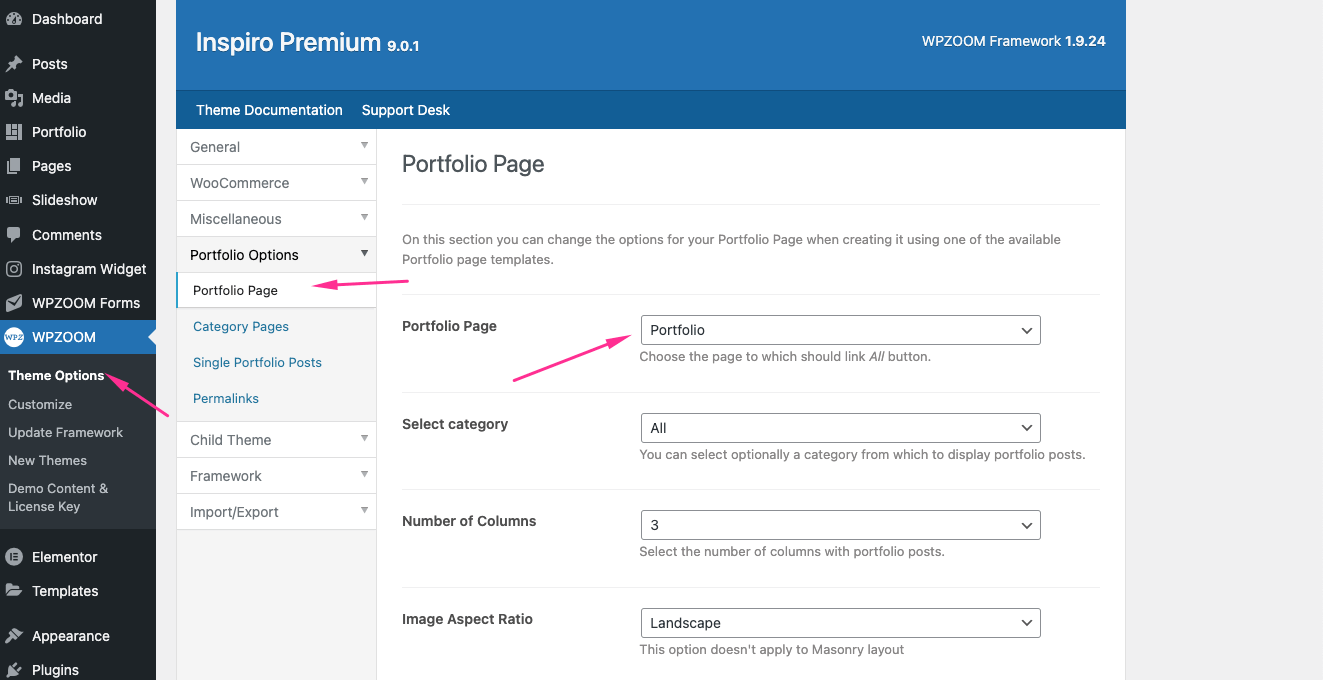 4. Set up your portfolio page via WPZOOM β Theme Options β Portfolio Options, selecting the page you created at step 3 in the Portfolio Page dropdown.