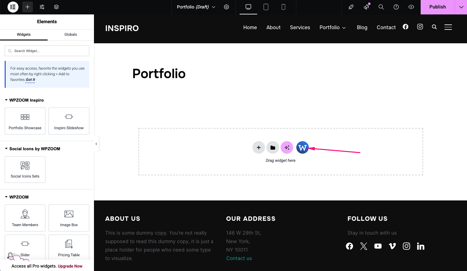 5.2. Inside Elementor, find the Portfolio Showcase widget in the Elements panel.