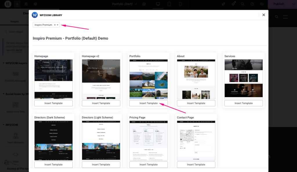6.1. Select Inspiro Premium in the templates filter, choose the template you want to load, and click on Insert Template.