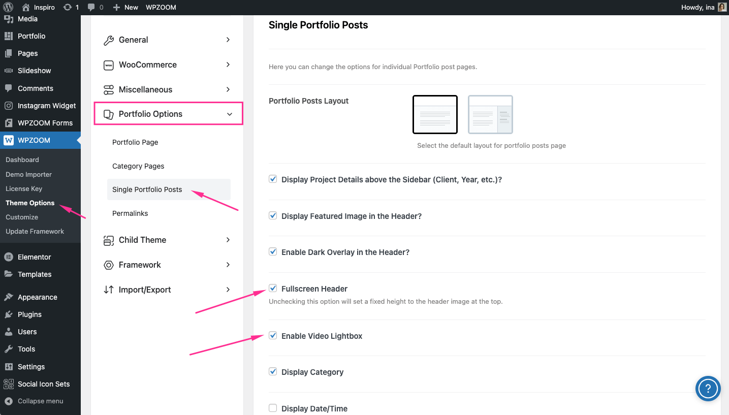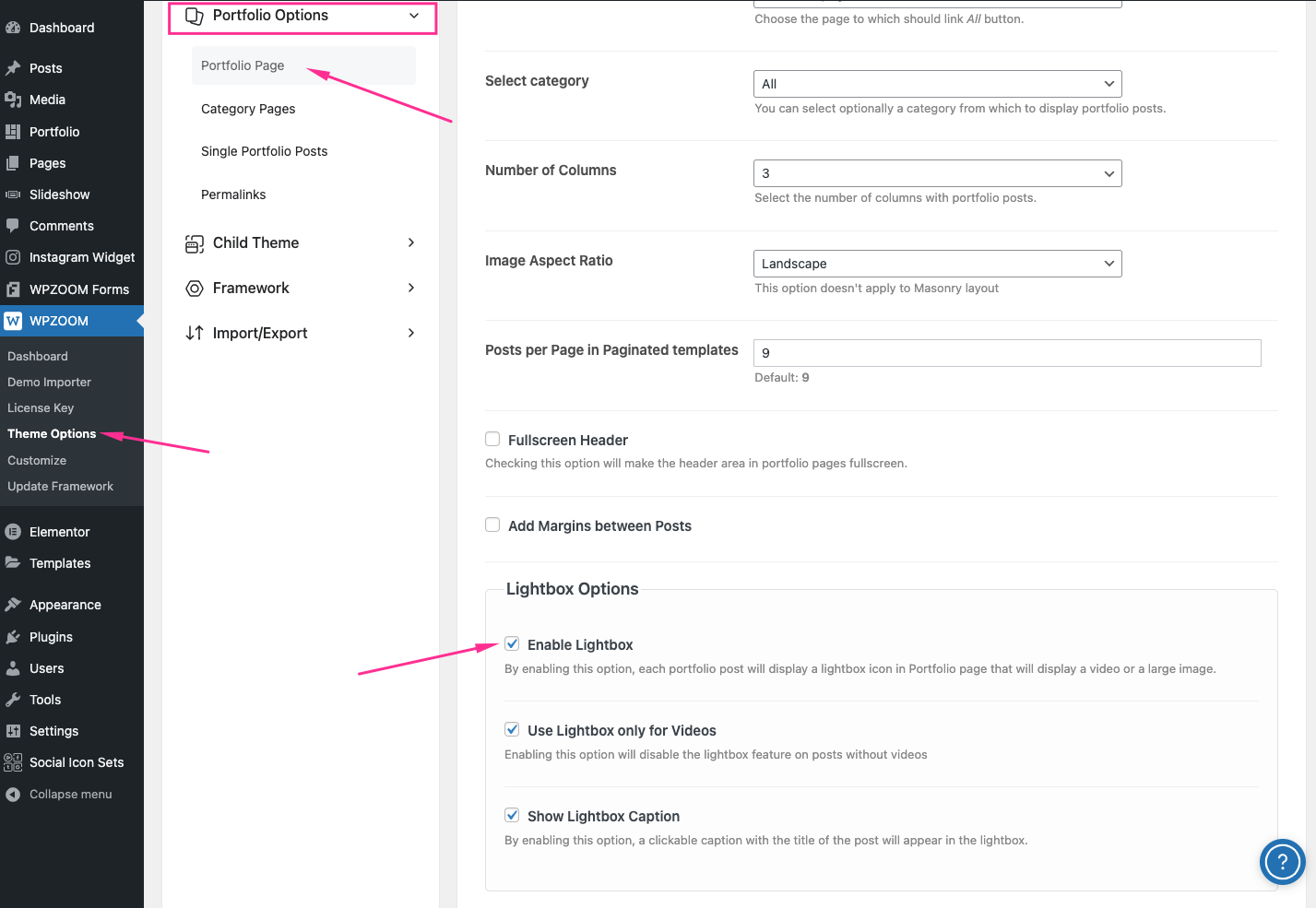 If you’re using the method to create a portfolio page or section with a built-in page template, here is how you can enable the Video Lightbox in this case: